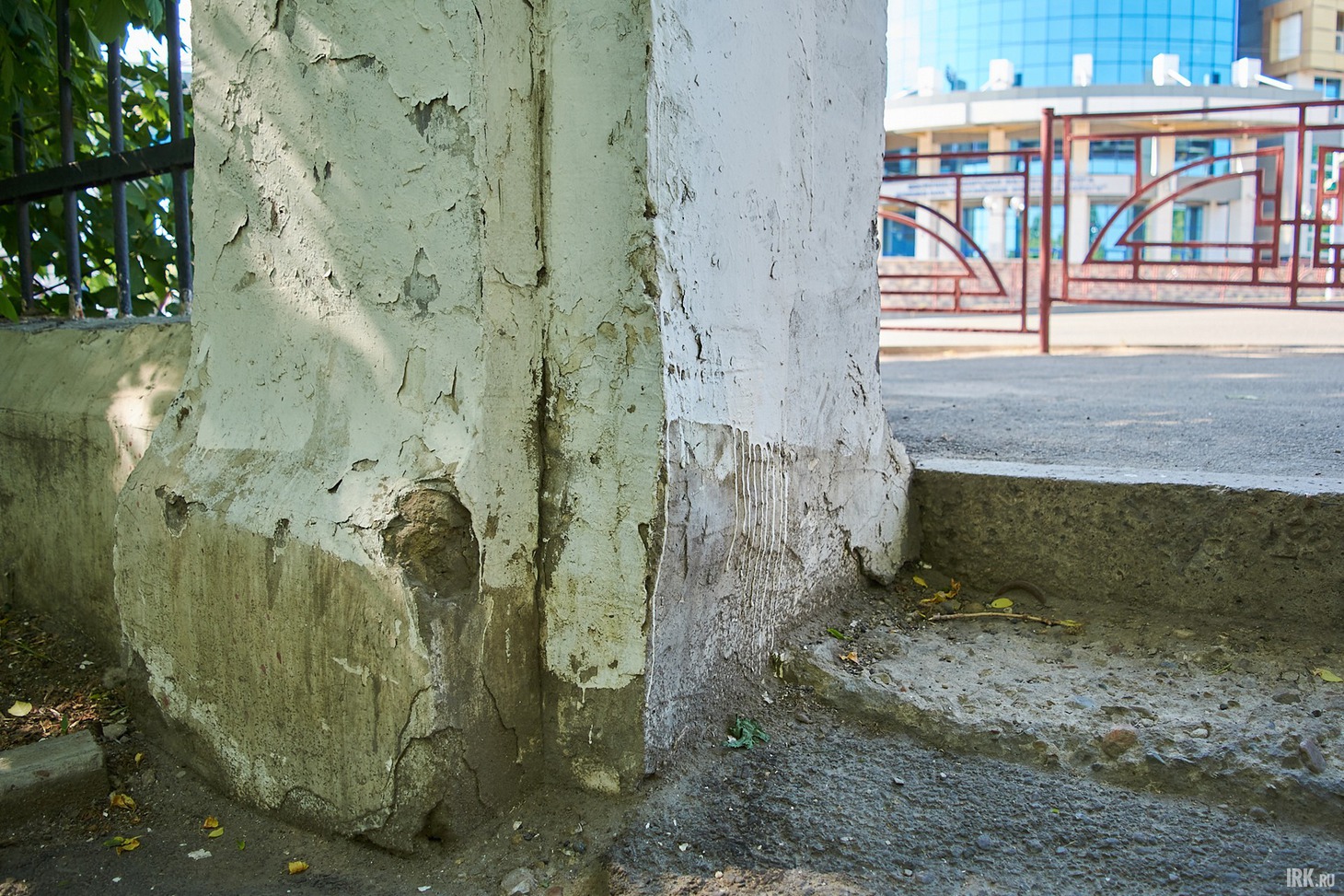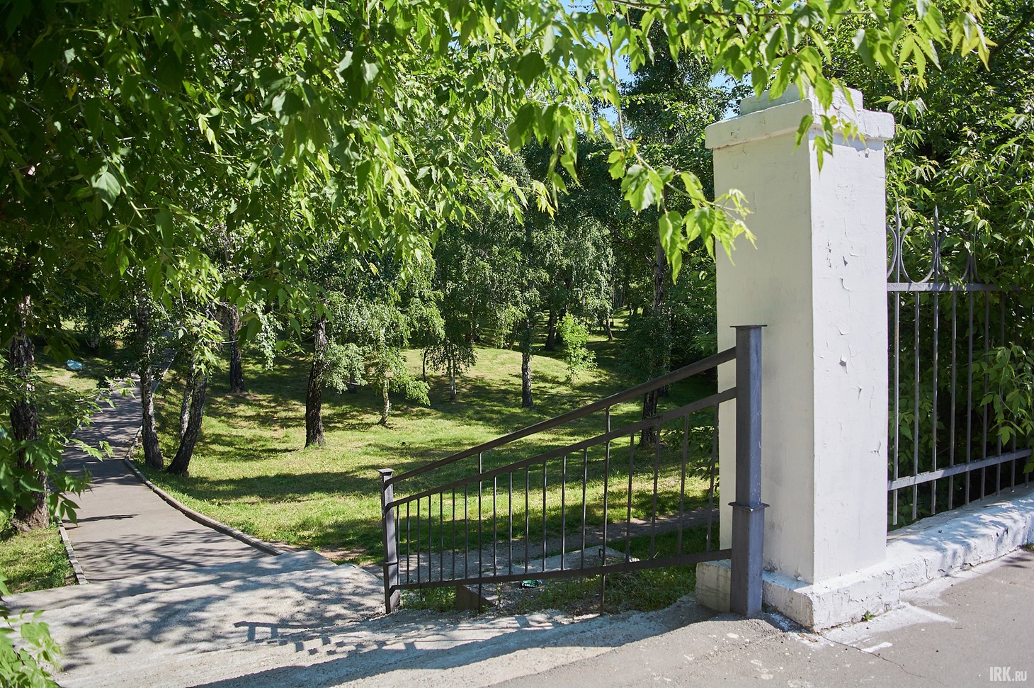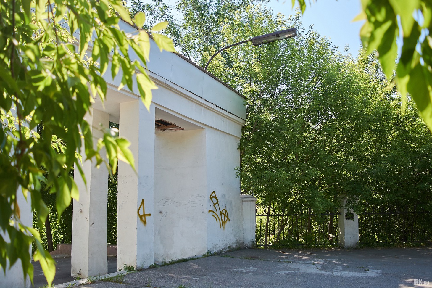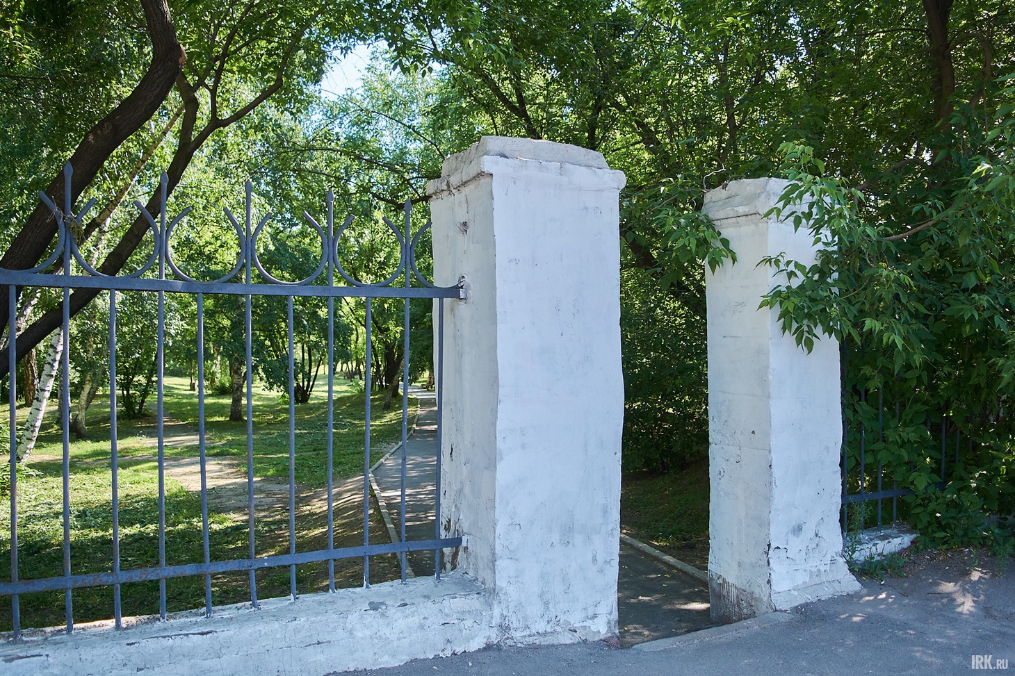 В парк заходим со стороны улицы 2-й Железнодорожной, где находится центральный вход. Из-за отдаленности от остановок общественного транспорта он не так популярен среди отдыхающих, между тем, смотрится впечатляюще: высокая арка с массивными белыми колоннами в окружении пышных зеленых деревьев. Входную группу отремонтировали три года назад, и сейчас выглядит она хорошо, хотя и видны следы варварского отношения отдыхающих.