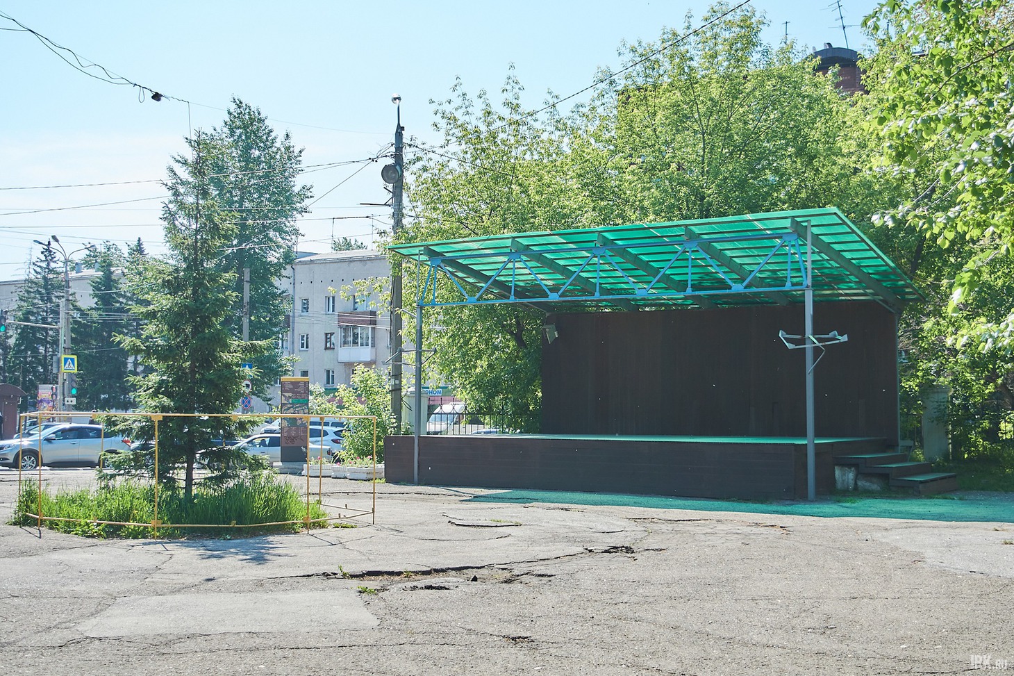 Перед сценой среди зарослей травы возвышается ель, огороженная и привязанная за макушку к проводам, чтобы не упала, — и выглядит она нелепо. Неужели нельзя было обустроить цветник под деревом, чтобы это дерево не смотрелось так уныло? По периметру небольшой площади установили скамейки и урны. В остальном это пространство выглядит так же, как и много лет назад, и даже современные элементы благоустройства особенно его не преобразили.