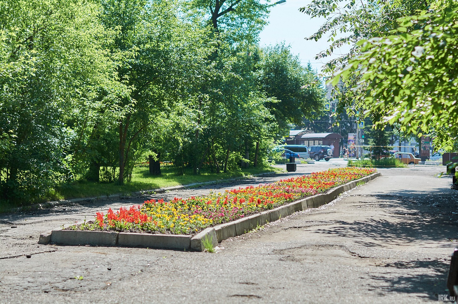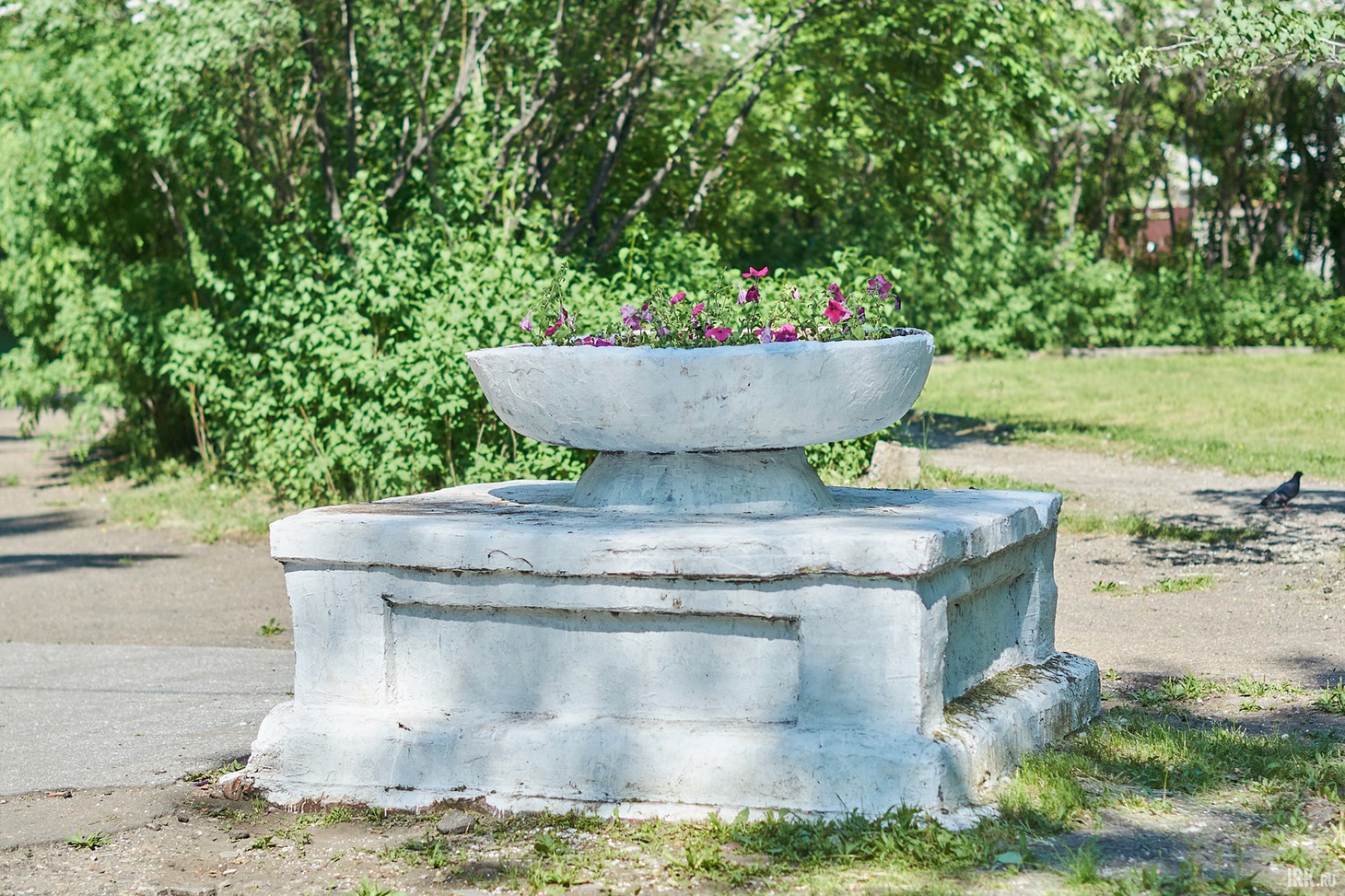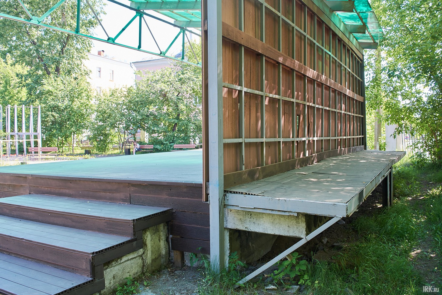 Идем смотреть вторую зону отдыха, расположенную возле входа в парк со стороны остановки «Райсовет». О том, что в этой части парка было проведено благоустройство, напоминают только скамейки и сцена, и то они уже нуждаются в ремонте, а вот клумбы и дорожки остались еще с советских времен. В целом, эта часть парка выглядит запущенной и несовременной. Сразу при входе в парк, справа, построили сцену для проведения районных мероприятий, обшив каркас досками. Сцену построили на старом бетонном основании — ничего плохого в этом нет, если его не было бы видно. К сожалению, конструкцию уже повредили: несколько досок валяются рядом. Возле ступенек, словно свалены в кучу, стоят несколько бетонных вазонов с высаженными цветами.