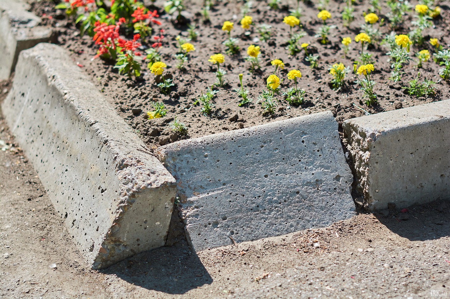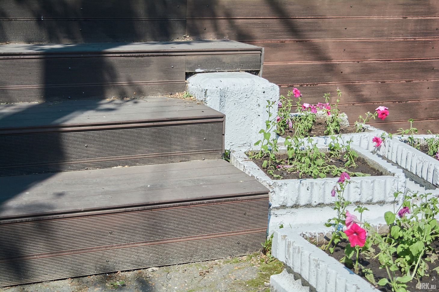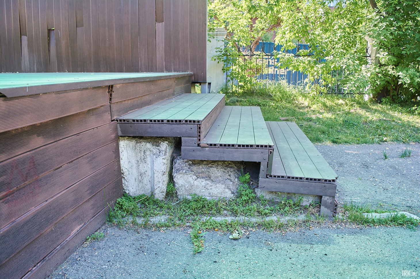 Идем смотреть вторую зону отдыха, расположенную возле входа в парк со стороны остановки «Райсовет». О том, что в этой части парка было проведено благоустройство, напоминают только скамейки и сцена, и то они уже нуждаются в ремонте, а вот клумбы и дорожки остались еще с советских времен. В целом, эта часть парка выглядит запущенной и несовременной. Сразу при входе в парк, справа, построили сцену для проведения районных мероприятий, обшив каркас досками. Сцену построили на старом бетонном основании — ничего плохого в этом нет, если его не было бы видно. К сожалению, конструкцию уже повредили: несколько досок валяются рядом. Возле ступенек, словно свалены в кучу, стоят несколько бетонных вазонов с высаженными цветами.