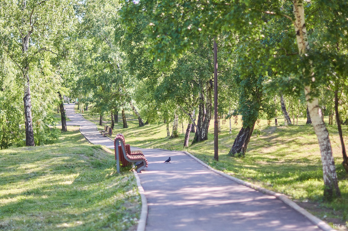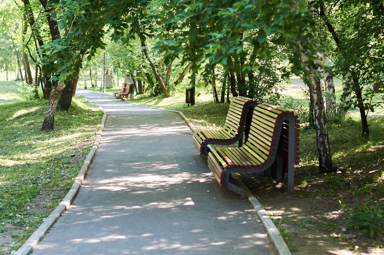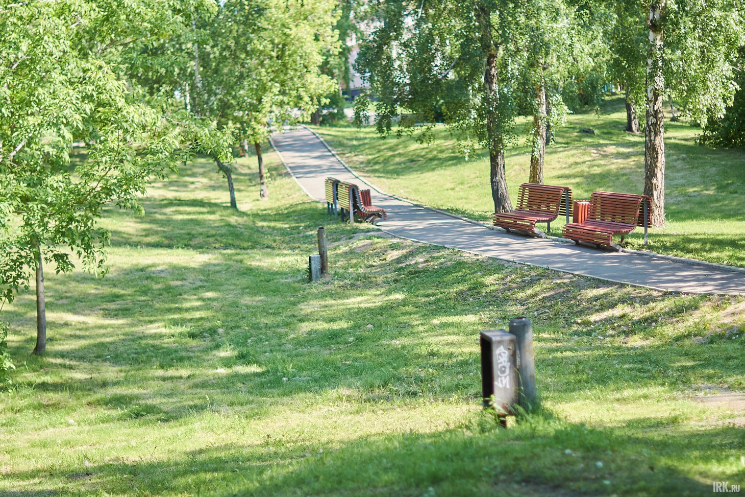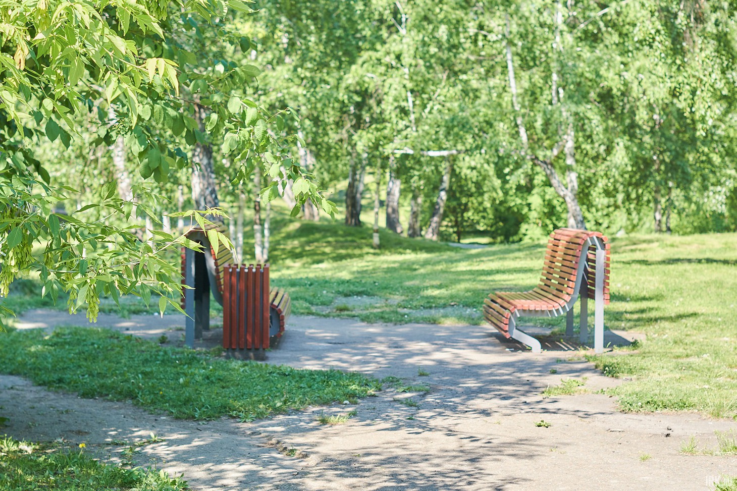 Во время ремонта в 2021 году центральную дорожку заасфальтировали, остальные оставили как есть, протоптанными среди деревьев тропинками. Не знаю, было ли так задумано, но, как мне кажется, благодаря этому решению и сохраняется ощущение, что ты на природе. К тому же, в основном они находятся на холмах и возвышениях. На благоустроенной дорожке поставили лавочки и урны — все в хорошем состоянии и без видимых повреждений.
