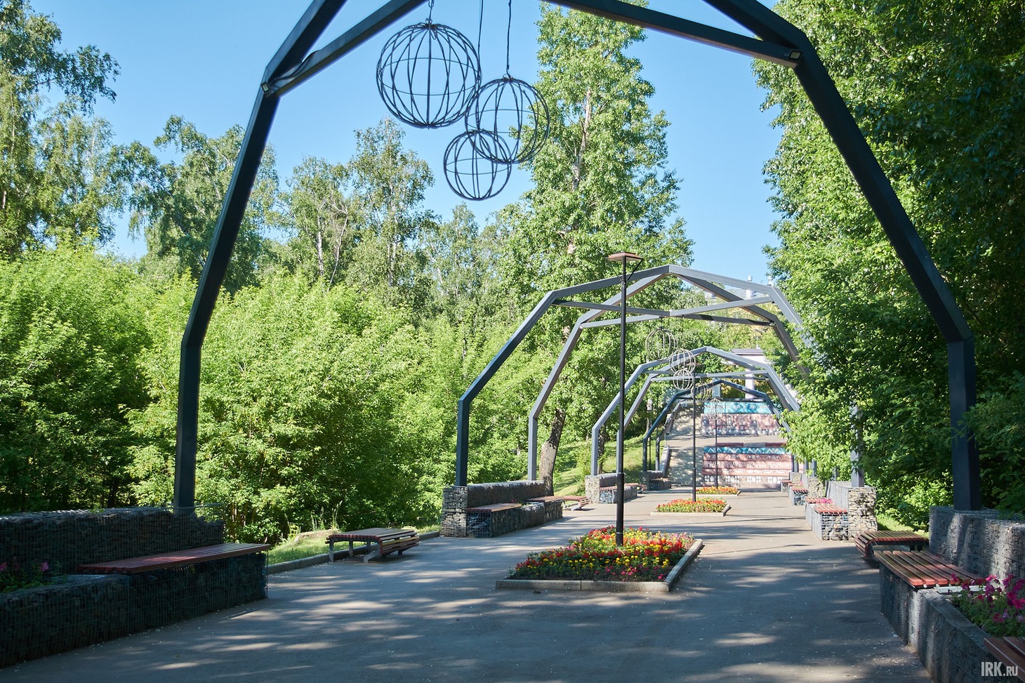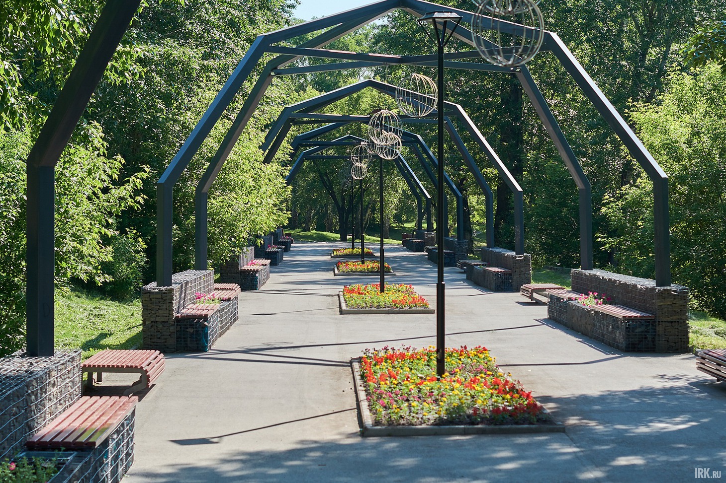 Главное украшение обновленного парка — металлические арки с большими подвесными шарами. Вечером, когда включается освещение и иллюминация, эти конструкции, напоминающие тоннель, начинают светиться, создавая здесь романтическую и даже волшебную атмосферу. Единственное, что портит впечатление, — лежащие на земле электропровода; остается надеяться, что их не повредят.