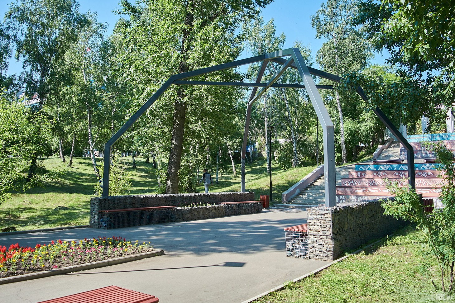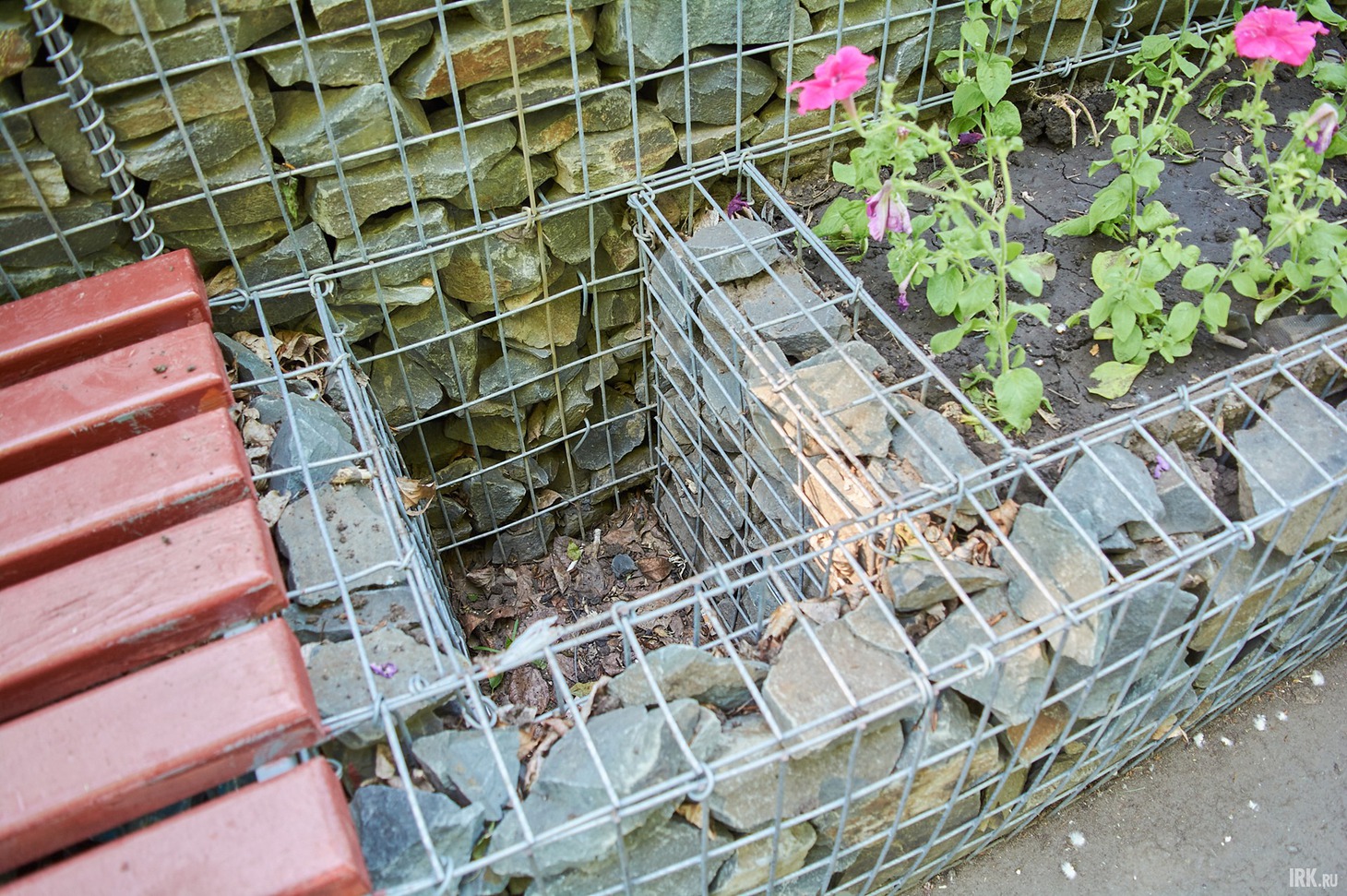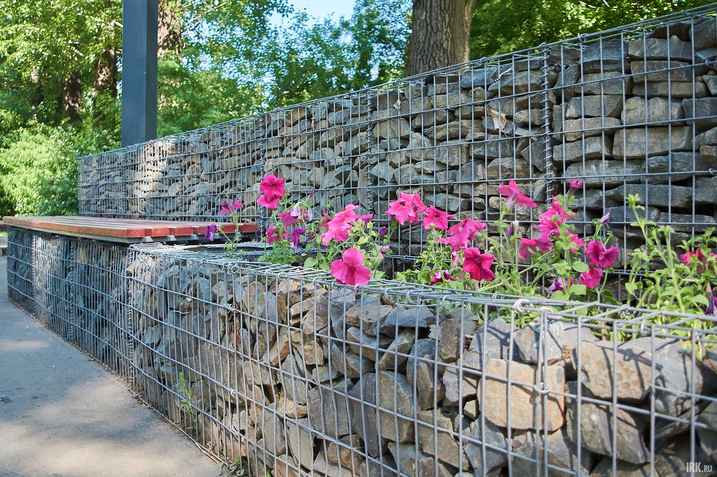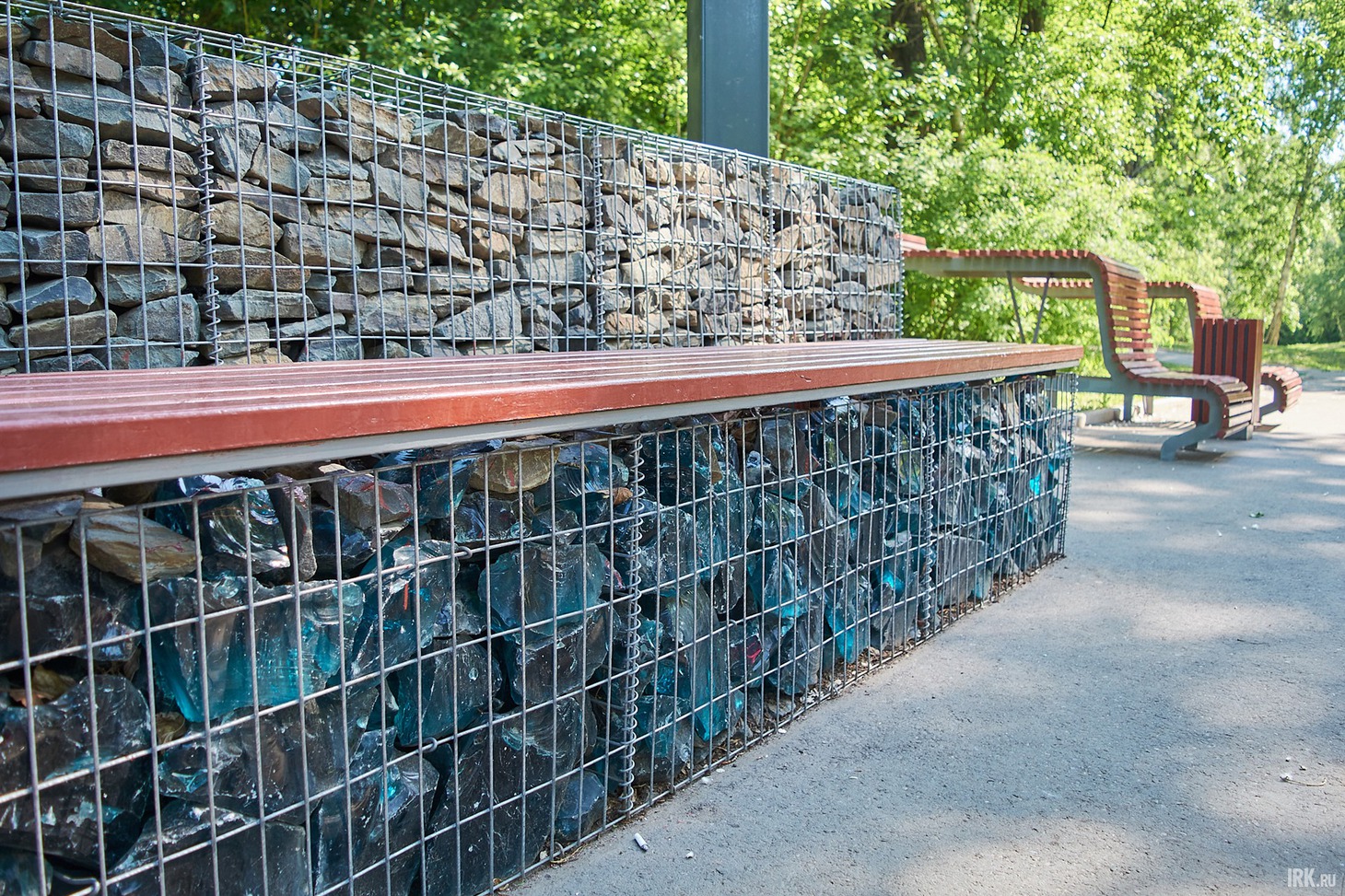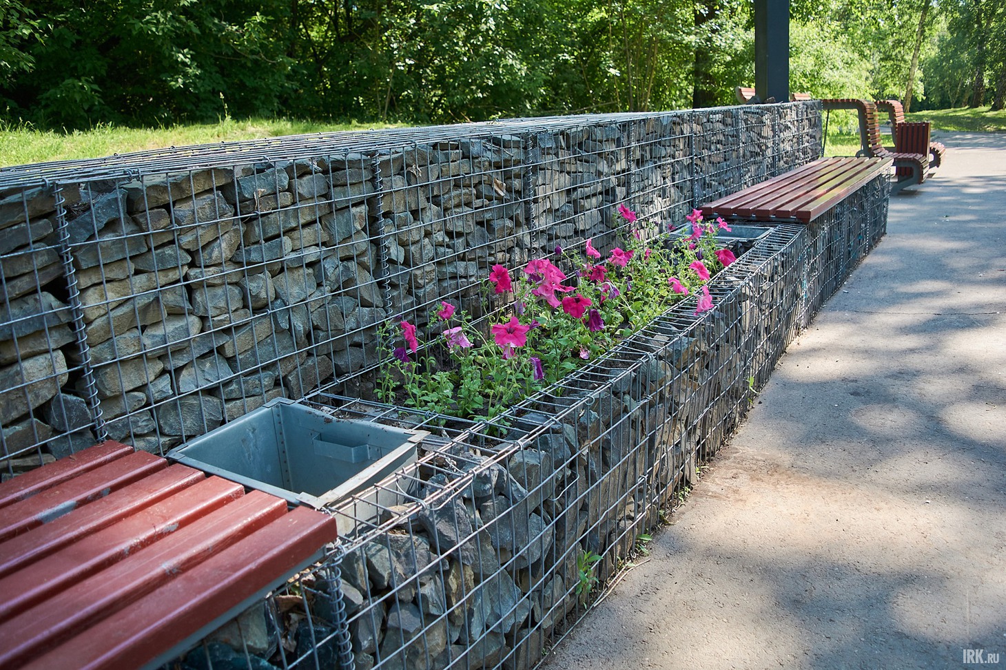 Между скамейками из габионов обустроили клумбы, и тут же — урны. И если во всем мире сейчас урны ставят вдали от мест отдыха, чтобы ни их внешний вид, ни запах не мешали горожанам, то здесь их поставили в нескольких сантиметрах от скамеек. Хорошо хотя бы, что урны пустые — спасибо местным работникам, которые следят за чистотой парка и выполняют свои обязанности на совесть.