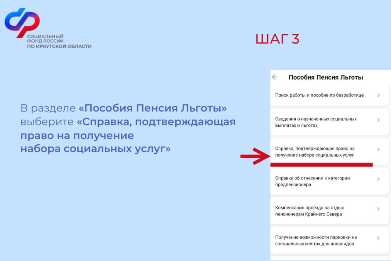 Если получатель набора социальных услуг ими не пользуется, он может получать вместо них деньги. Для этого необходимо направить в Отделение Социального Фонда России по Иркутской области соответствующее заявление до 1 октября текущего года. В этом случае стоимость набора социальных услуг (социальной услуги) с 1 января следующего года будет включена в размер ежемесячной денежной выплаты (ЕДВ).