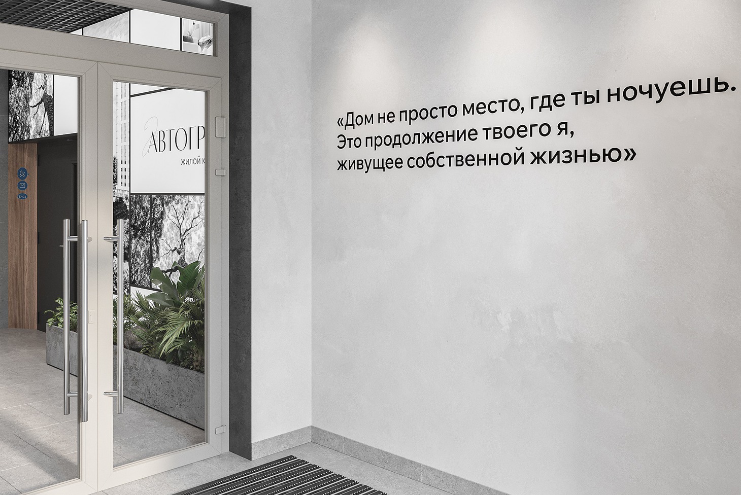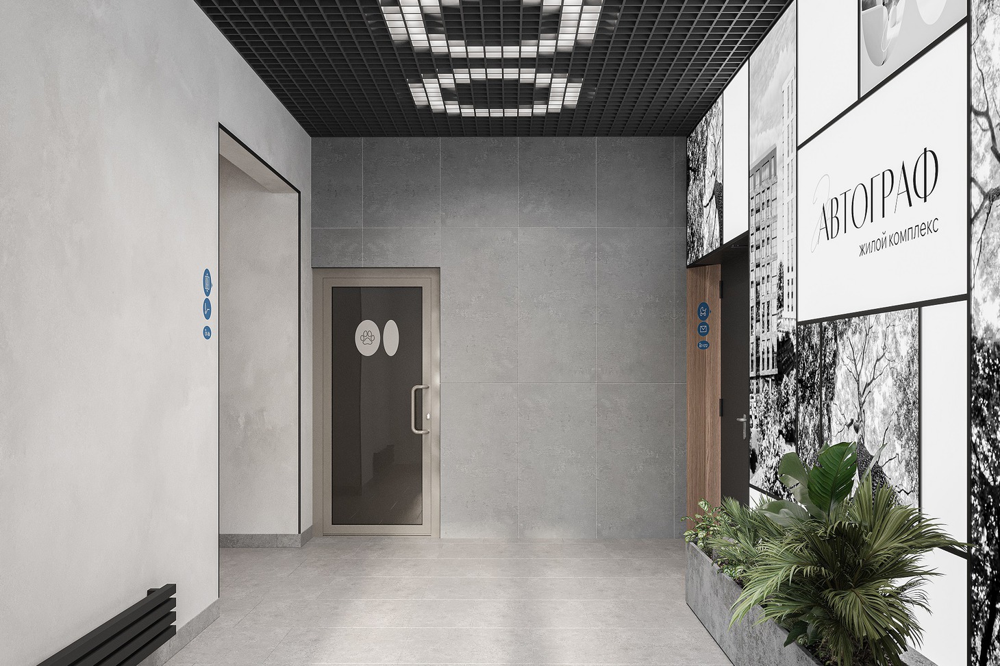 Дизайну лобби жилого комплекса «Автограф» создатели уделили особое значение. Интерьер выполнен в тепло-серых тонах, отражая атмосферу стабильности и спокойствия. Для максимального комфорта жителей и их питомцев во входной группе предусмотрены лапомоечные, санузел, просторные колясочные для мамочек с детьми.