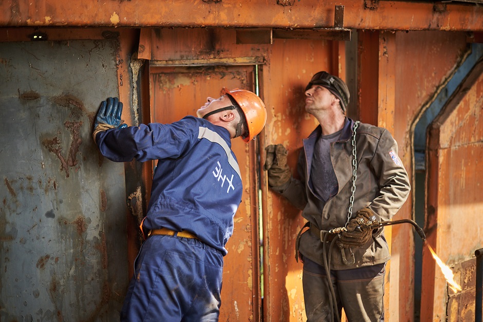 На объекте работают пять человек, в большем количестве специалистов необходимости пока нет, в дальнейшем люди понадобятся при транспортировке и монтаже. Мастер участка по ремонту экскаваторов Михаил Наумов рассказал, что при демонтаже задействованы слесари и сварщики.