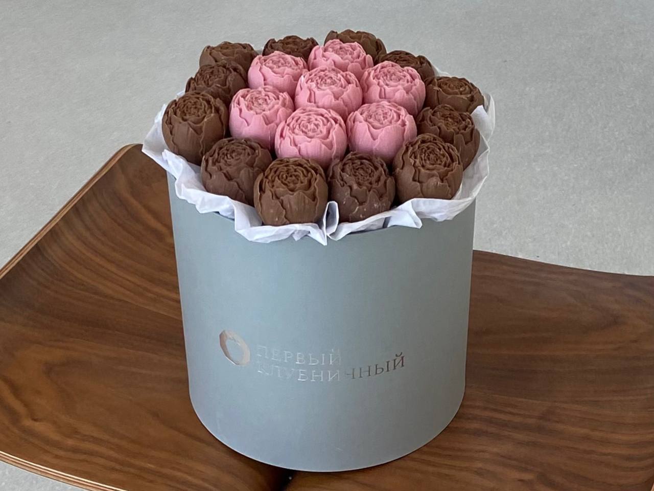 ТОП-2: букет из шоколадных пионов в боксе. Цветы из шоколада, которые точно произведут впечатление. Они не только красивые, но и очень вкусные, к тому же не завянут. Пионы выполнены из бельгийского молочного, белого, темного, клубничного, карамельного, апельсинового шоколада.