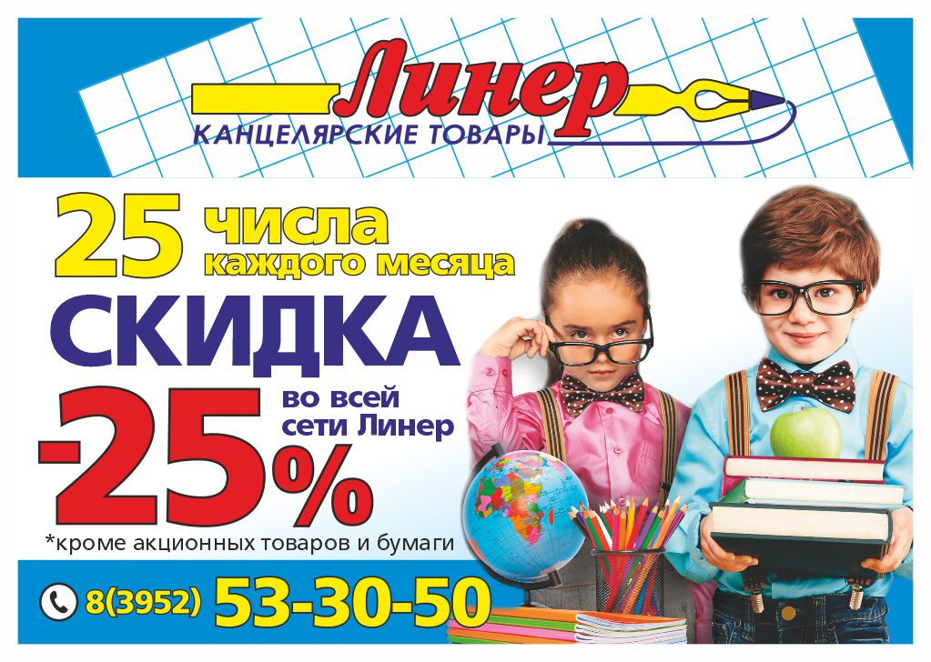 Все нужные товары для школы можно приобрести в розничных магазинах «Линер», расположенных во всех районах Иркутска, Ангарска, Шелехова, Усолье-Сибирское, Черемхово и Свирска, а также в интернет-магазине www.linerirk.ru. В «Линере» всегда есть большое разнообразие товаров для школы, творчества, канцелярских принадлежностей, а в интернет магазине никогда не бывает очередей! Однако поход в розничные магазины тоже является приятным занятием, ведь наши консультанты всегда помогут с выбором и расскажут об ассортименте. Приходите и вы готовиться к учебному году вместе с компанией «Линер» и не забывайте про нашу юбилейную скидку* «25 числа каждого месяца -25%»!