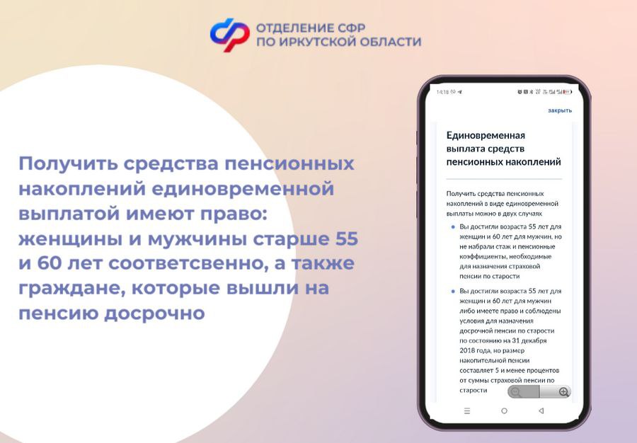 У кого возникает право на получение пенсионных накоплений единовременным платежом? У женщин с 55 лет и мужчин с 60 лет, а также у граждан, которые вышли на пенсию досрочно.