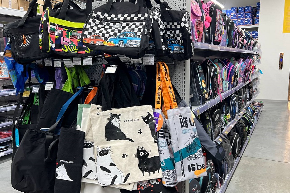 Для школьников представлен большой выбор рюкзаков и сумок, для взрослых — шопперов. Есть отдел для художественных школ и арт-студий. Покупателям предлагают профессиональную линейку от бренда «ГАММА» — холсты, мольберты, краски, кисти. Кроме этого, на первом этаже гипермаркета находятся настольные игры — обучающие, карточные, на эрудицию, лото, домино, шашки, шахматы. Есть и наборы для рисования картин песком, пластилин и другие вещи для хобби и развлечений.