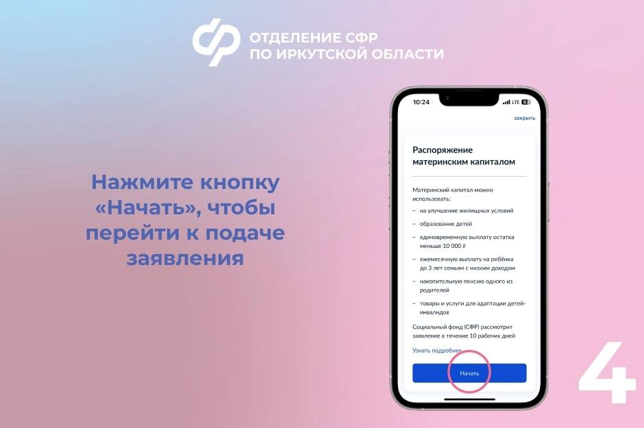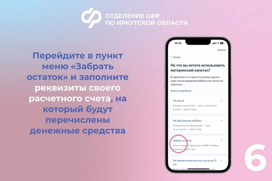 Чтобы получить такую выплату, необходимо подать в Отделение СФР по Иркутской области заявление. Сделать это можно дистанционно через госуслуги или лично, обратившись в любую клиентскую службу Отделения фонда или МФЦ. В заявлении нужно указать только реквизиты банковского счета для зачисления денежных средств. Сумму остатка на сертификате вписывать не требуется, поскольку эти данные есть в распоряжении регионального Отделения СФР.