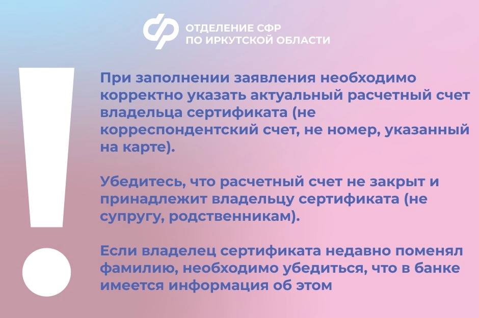 Важно корректно заполнить реквизиты счета получателя. Счет должен принадлежать владельцу сертификата, а не супругу или другому родственнику. Необходимо верно указать расчетный счет. Это должен быть не корреспондентский счет, не номер карты, а именно расчетный счет. Также стоит обратить внимание на соответствие фамилии в паспорте и реквизитах счета. Бывают такие ситуации, когда мама сменила фамилию, а карта в банке осталась на прежнюю. В таких случаях при зачислении денежных средств нам придет возврат. Необходимо, чтобы фамилия в паспорте и в банковском счете совпадали.