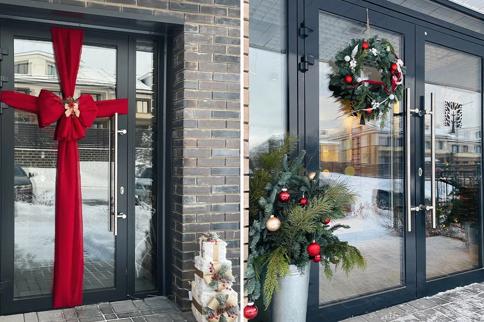 Если покажется мало, то веточками с ягодами, шишками или бантами можно декорировать всю входную группу. Кстати, банты в этом году тоже в тренде — не жалейте их для украшения.