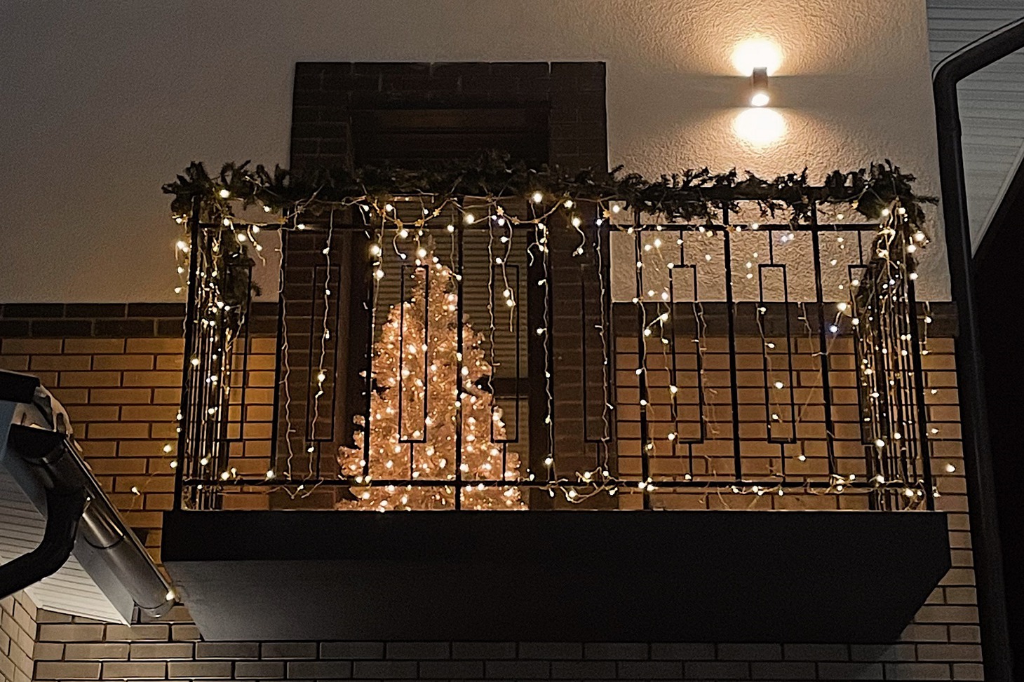 И всё же начнем с огоньков, иначе какой Новый год без гирлянды? Так как в домах «Хрустального парка» преимущественно панорамные окна, то можно установить гирлянды-шторы. С улицы это всегда смотрится очень красиво и нарядно.