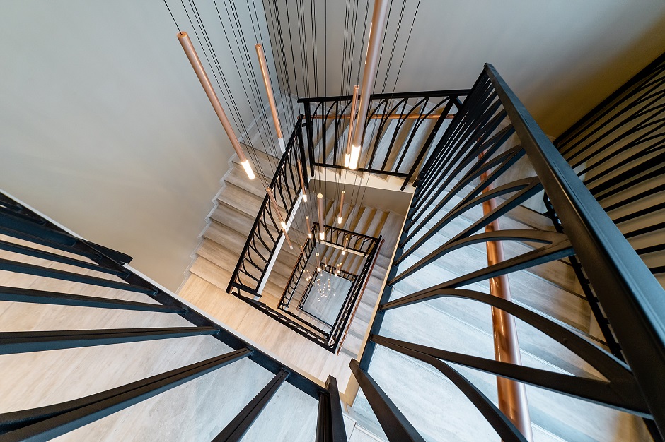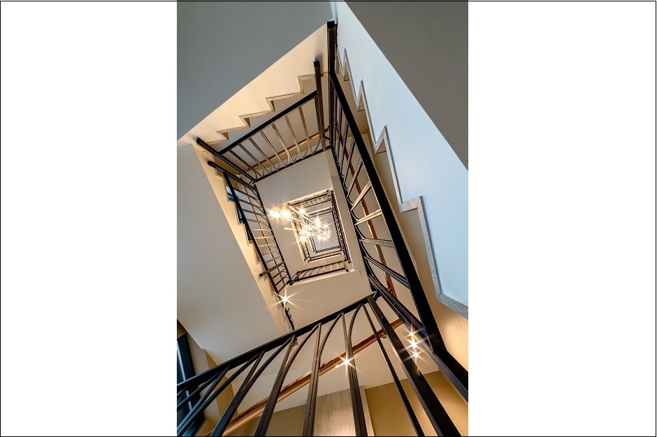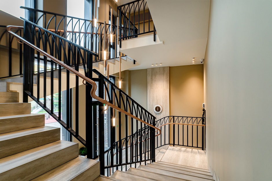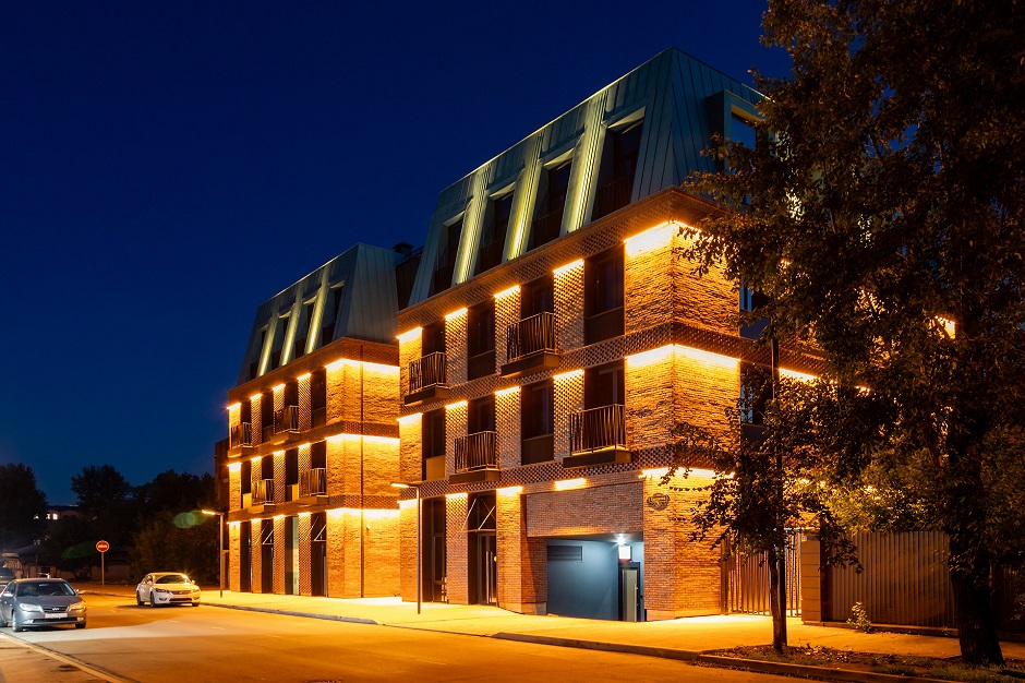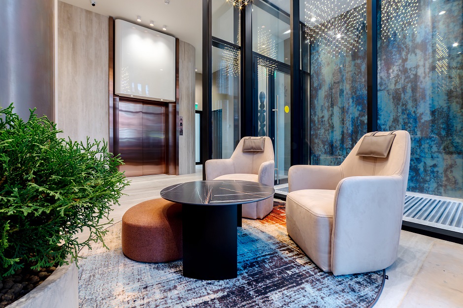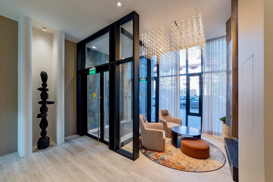 За эффектным фасадом, органично вписанным в ансамбль деревянного зодчества Иркутска, скрывается не менее впечатляющее внутреннее пространство, которое дизайнеры смело называют «галереей современного искусства». Переступив порог, житель и его гости попадают в лобби, где сразу возникает ощущение уюта и приватности. Центральным элементом здесь стал камин — он не только создает атмосферу тепла, но и зрительно вытягивает холл.