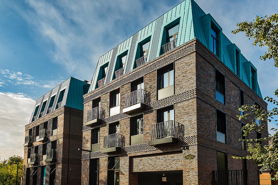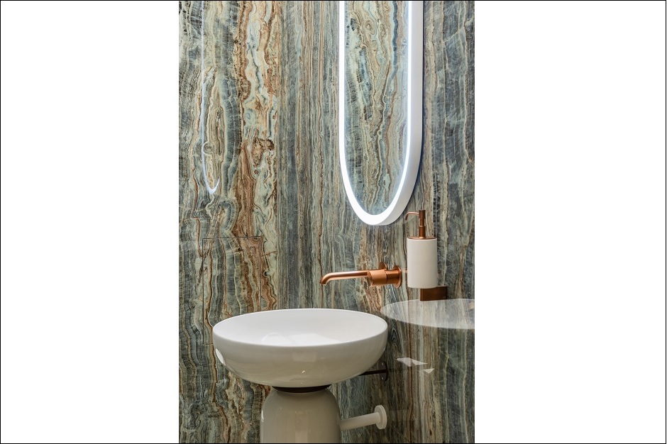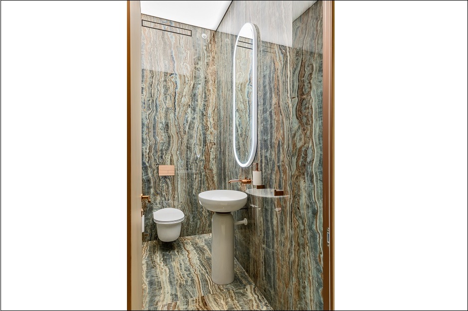 Цветовая палитра интерьера родилась не случайно. Как объяснила Вера Калинина, она является логичным продолжением архитектуры фасада: «Мы анализируем, какие цвета и фактуры есть снаружи, чтобы человек, заходя, не испытывал диссонанса. Так, кирпич превратился в медный акцент, который стал лейтмотивом всего дома — его можно встретить в металле лифта, деталях отделки. А бирюзовые оттенки крыши перешли в ковер и акцентную стену при входе».