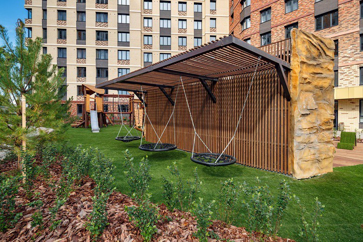 Во дворе ЖК создана комфортная среда как для взрослых, так и для детей. Пространство организовано с исключительной внимательностью к деталям: удобные лавочки в тенистых уголках для отдыха, современные детские площадки с безопасным покрытием, и уютные качели, где можно расслабиться после долгого дня. Каждый элемент благоустройства гармонично вписан в общую концепцию территории.