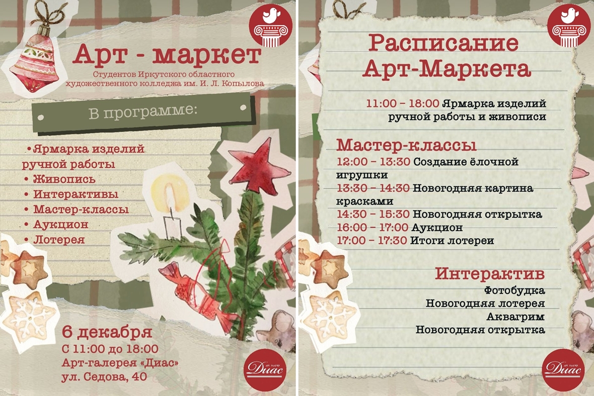 6 декабря, в субботу, с 11:00 до 18:00 в арт-галерее «Диас» пройдёт новогодний «Арт-маркет» студентов Иркутского областного художественного колледжа им. И.Л. Копылова.