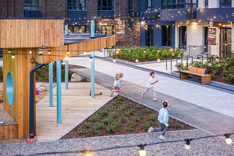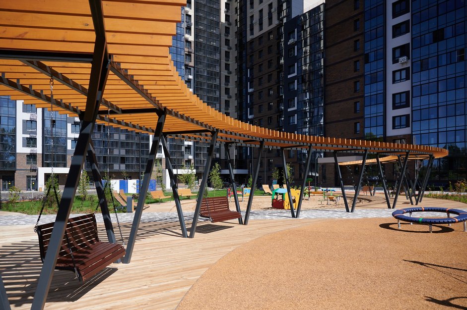 - Большие закрытые дворы без машин. Это не простые участки между парковками, а целые зеленые зоны для жизни. К примеру, в концепт-парке «Семья» территория двора занимает 1,3 гектара, а в ЖК «Сибиряков» – 1,2 гектара.