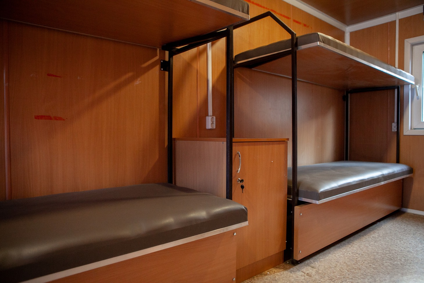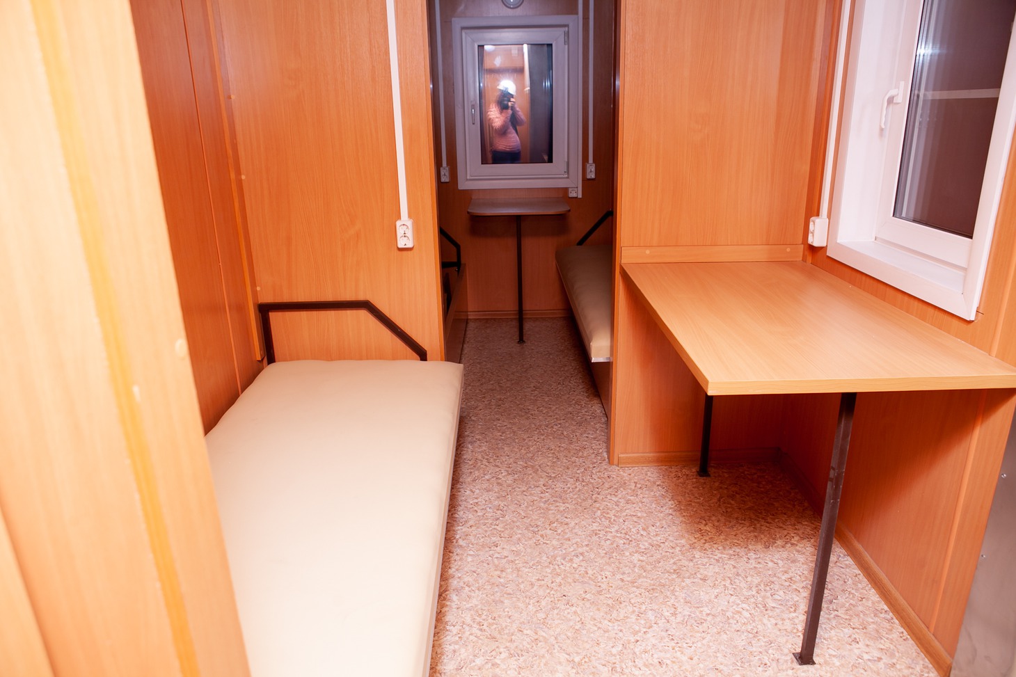 Как производят панели? Кладется лист металлопрофиля, на него – слой клея, сверху – ориентированно-стружечная плита (OSB), затем – снова клей, утеплитель, клей и сверху ЛДСП, пластик (если вагон санитарного назначения) или металл (если речь идет про мастерские). Потом все отправляется на 40 минут под пресс. Компрессор прессует обкладку с утеплением в печке. Тут же производят лежаки для кроватей, нащельники, вставляют окна и двери в панели.