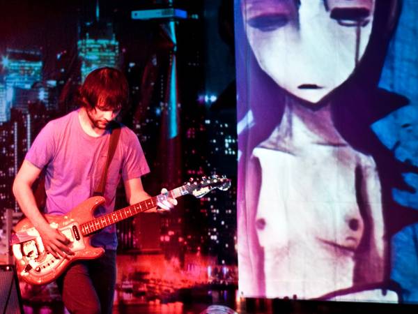 Свет на сцену почти не давали, и весь зал стоял во мраке. Позади сцены проектор отображал удивительной шизофреничности картины: чахлых эмбрионов с дырой в голове, скелетообразных девушек, остовы человеческих тел и прочую ужасную муть. И музыка, соответственно, электронно-загробная.