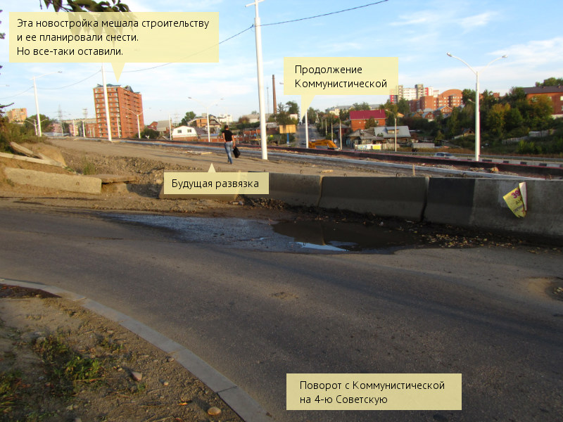 Строительство развязок состоит из двух этапов. Первый начат в ноябре 2010 года. Он включает в себя развязки по улице Седова до улицы Лебедева-Кумача, а также пешеходный путепровод на улице 4-я Советская. На втором этапе будет строиться развязки от улицы Лебедева-Кумача до улицы Партизанской с пересечением улицы Байкальской. Второй этап предполагает также расширение улицы Трилиссера.
