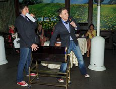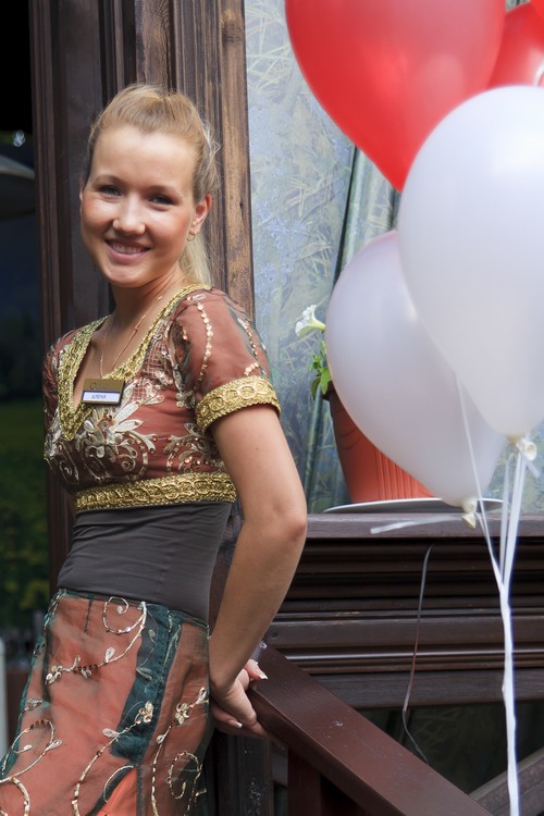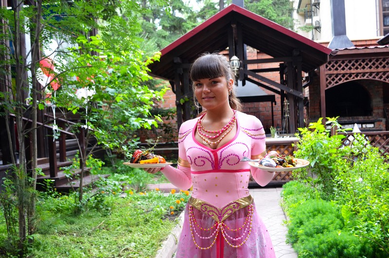 У самого входа гостям предлагали облачиться в солнцезащитные очки и нарядные шляпы. Пляжный фотограф тут же предлагал сделать фотографию на память. Отставший от поезда пассажир приглашал скоротать время за рюмкой крепкого напитка, а на летней веранде всех встречали морская русалочка, пускающая мыльные пузыри, и гостеприимные официанты в костюмах народов разных стран.