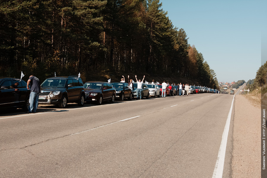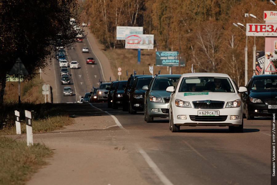 Празднование решено было провести не совсем традиционно, но, как всегда, весело и ярко — автопробегом до Листвянки! В пробеге приняло участие более трех десятков автомобилей Skoda различных моделей, среди которых были и «эксклюзивные представители», такие как Octavia RS и Fabia Monte Carlo. Все автомобили-участники были украшены автомобильными флагами и наклейками, а их владельцы — брэндированными футболками.