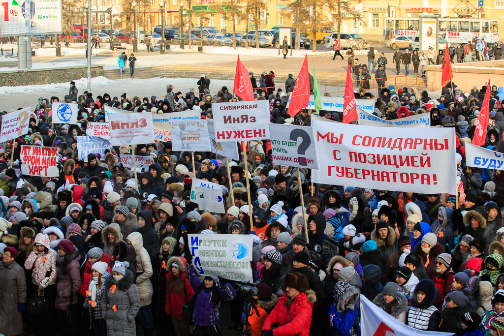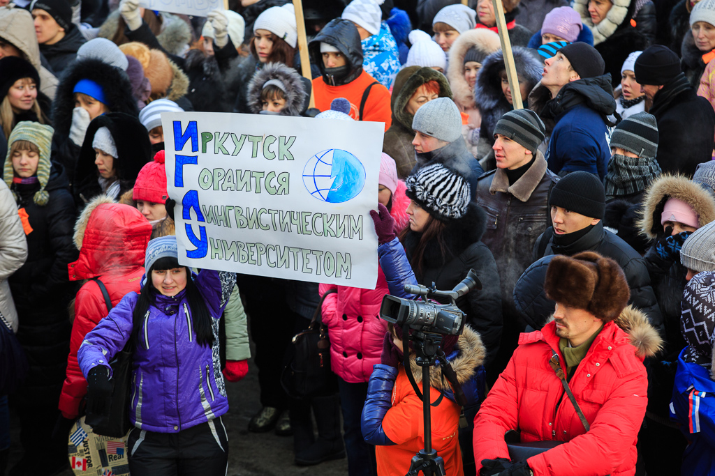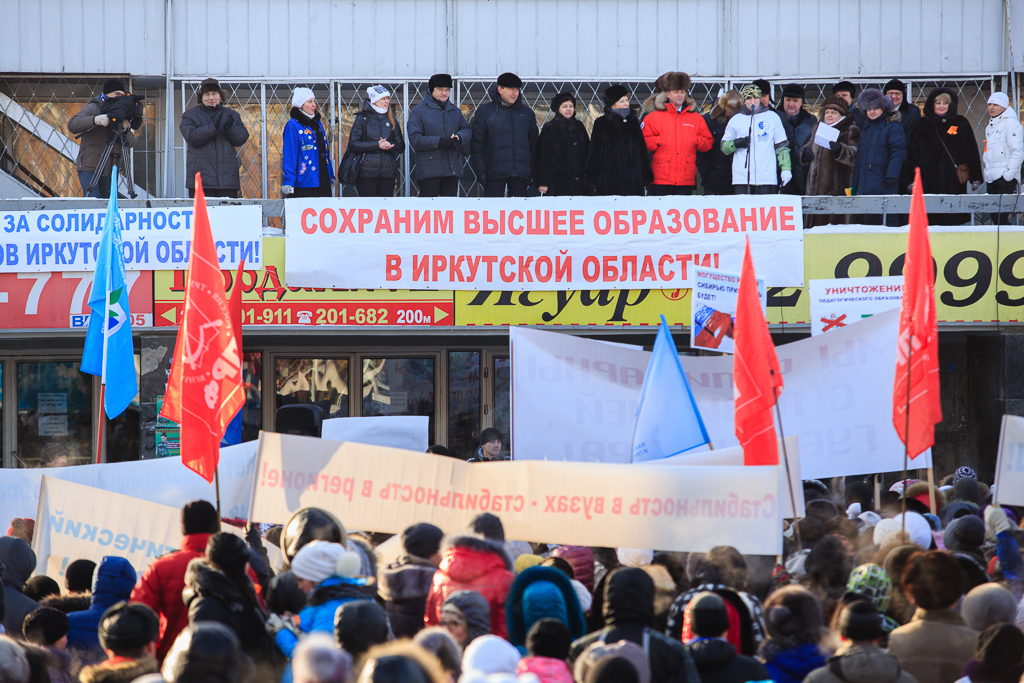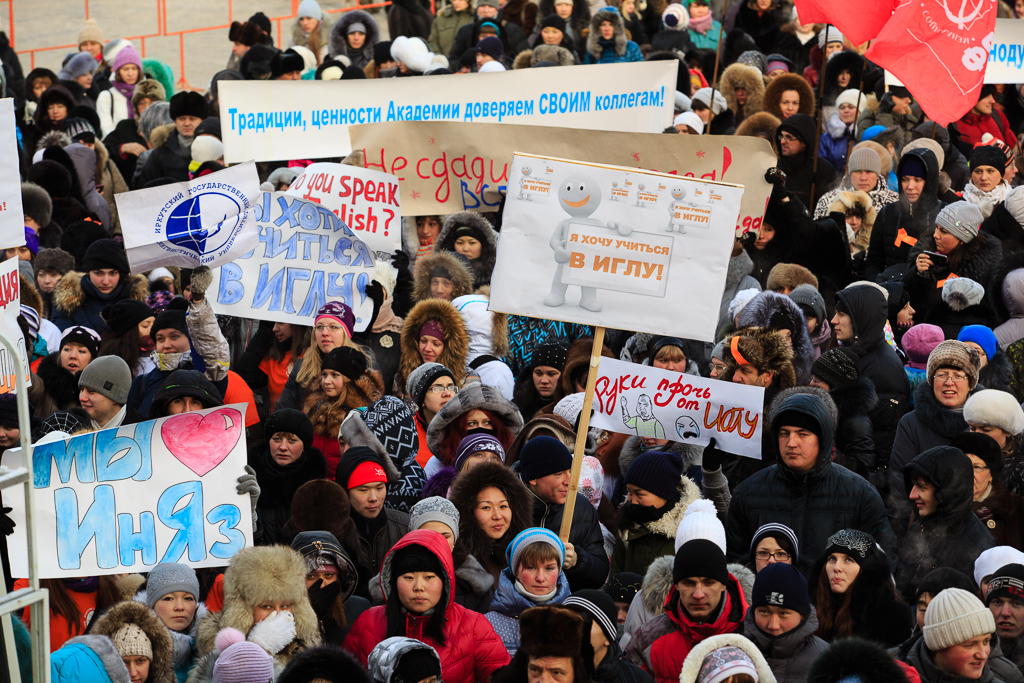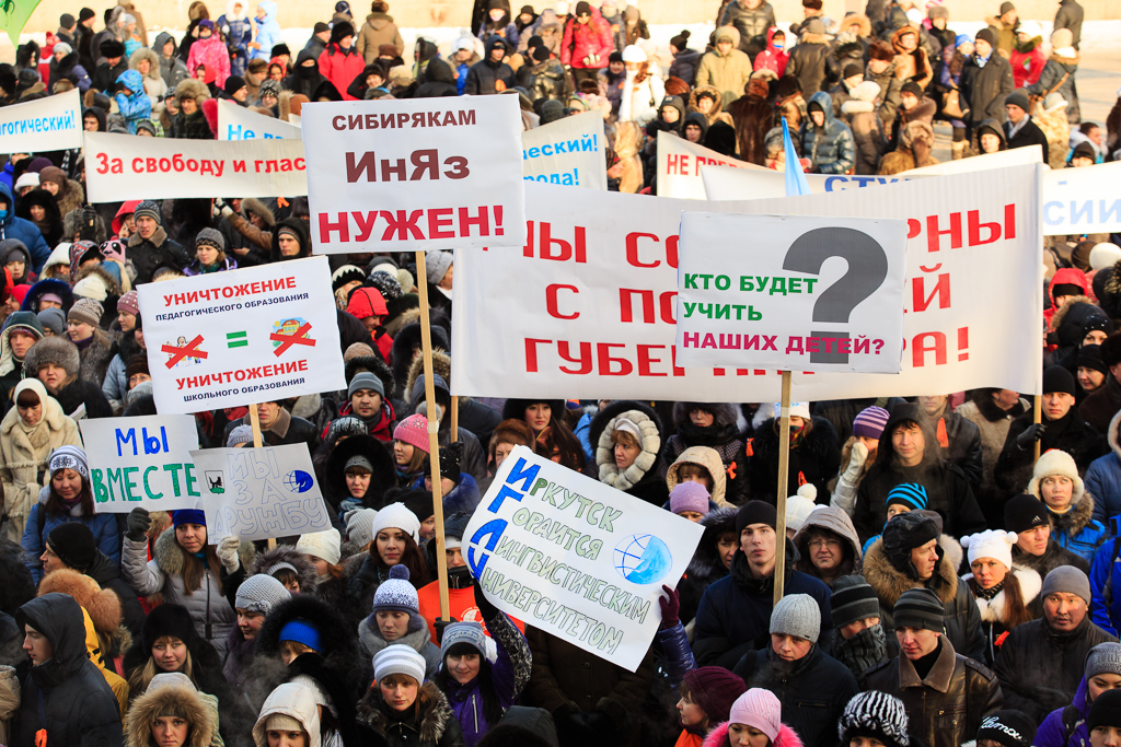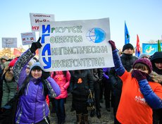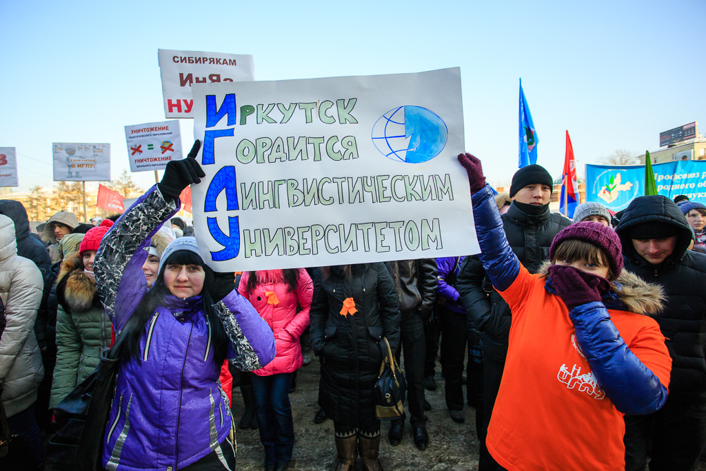 7 декабря на площади у стадиона «Труд» в Иркутске состоялся митинг студентов и преподавателей Иркутского государственного лингвистического университета (ИГЛУ) и Восточно-Сибирской государственной академии образования (ВСГАО). Они опасаются, что педагогический и лингвистический вузы подвергнутся реорганизации. В акции приняли участие около 1000 человек.