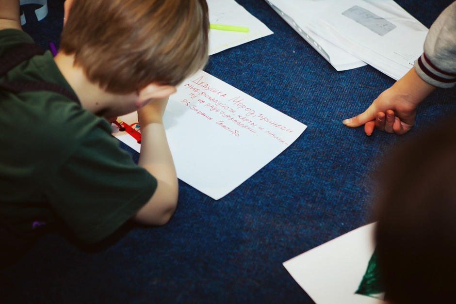 В то время как взрослые дружно выполняли задания и отгадывали зашифрованные коды, в теплом банкетном зале ребятишки водили хоровод и писали письма Деду Морозу вместе с гномиком Весельчаком, а их мамочки учились вязать новогодние украшения и снежинки на мастер-классе.