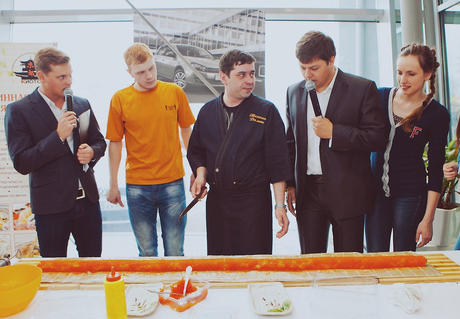 Сколько проедет Volkswagen Golf на одном баке? «От Иркутска до Калифорнии» — его расход от 4,2 литра на 100 километров! Показать это символично решили давние партнеры автоцентра Volkswagen — ресторан классической японской кухни «КИОТО». Под руководством шеф-повара ресторана Романа Тихонова будущие владельцы Golf VII создали ролл «Калифорния» длиной 1,5 метра.
