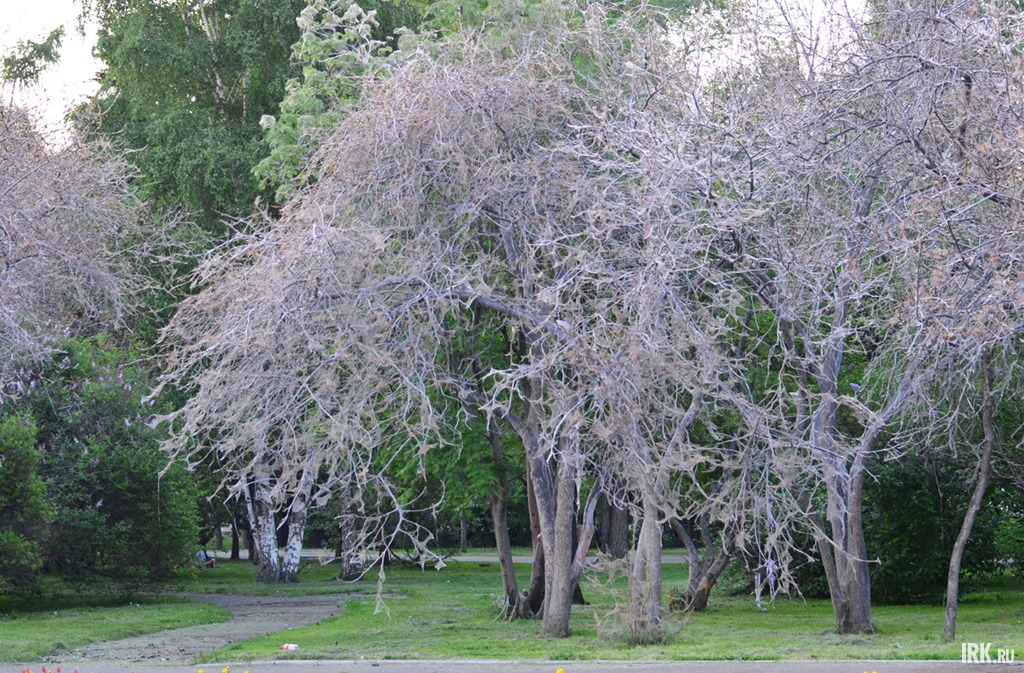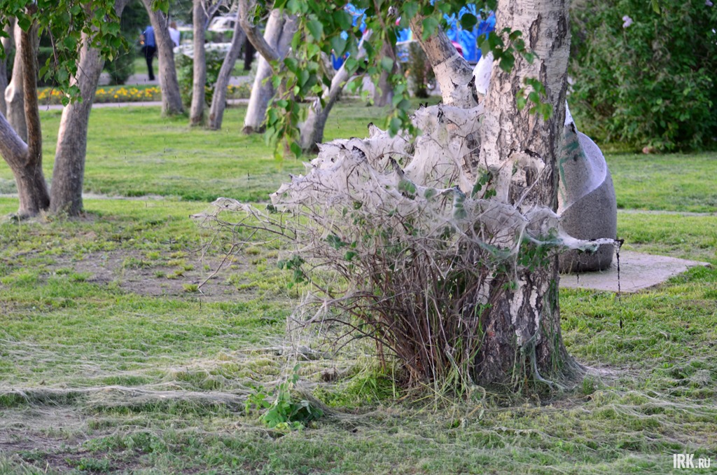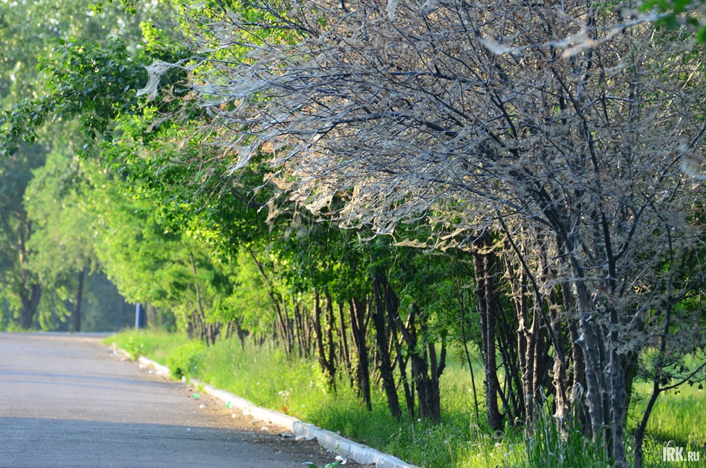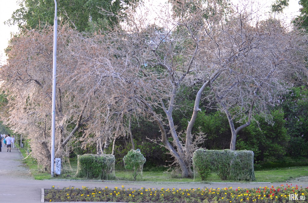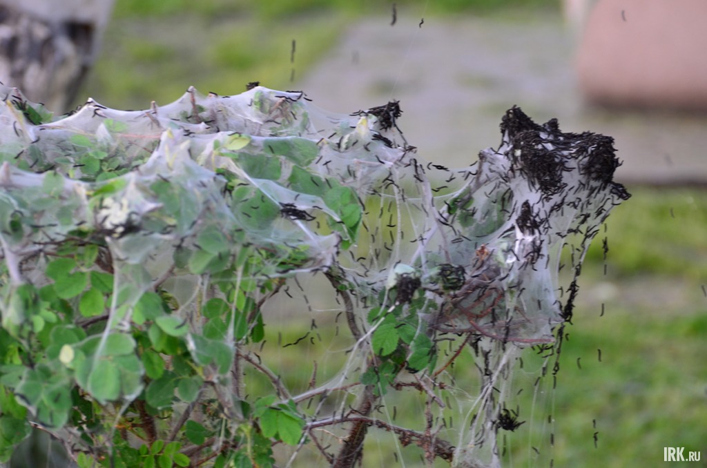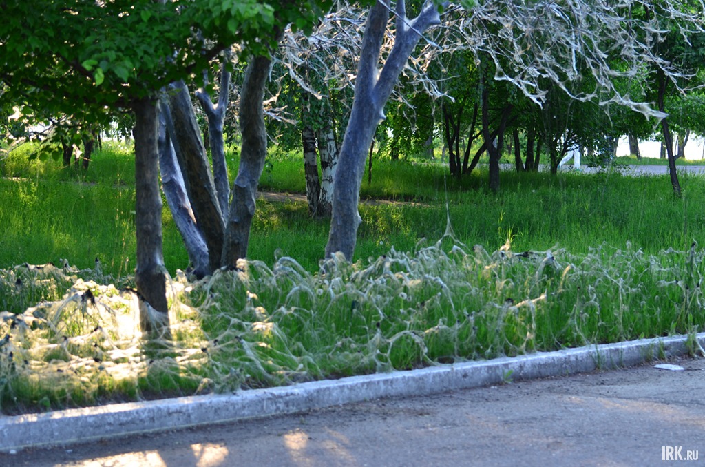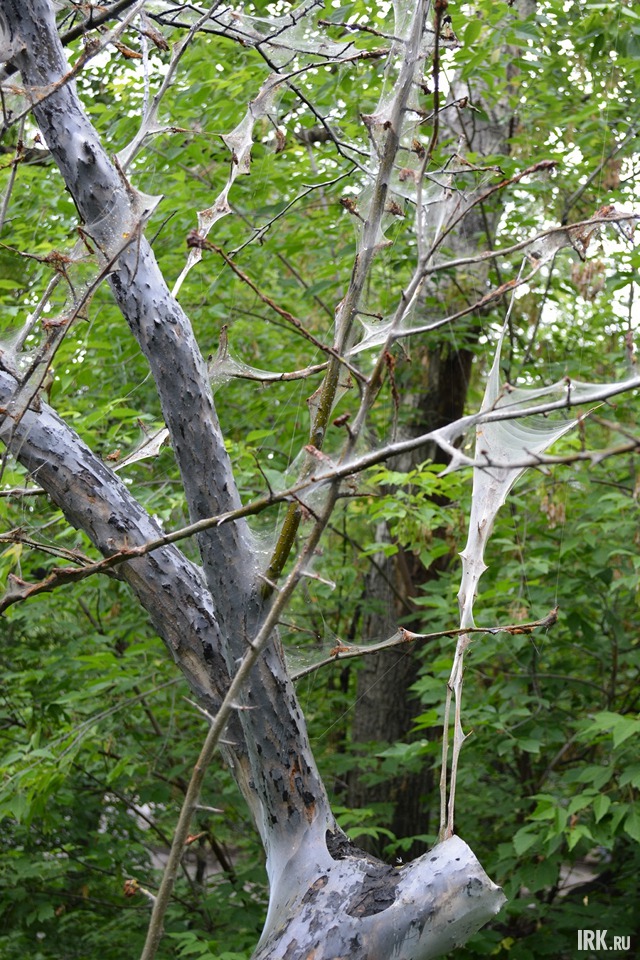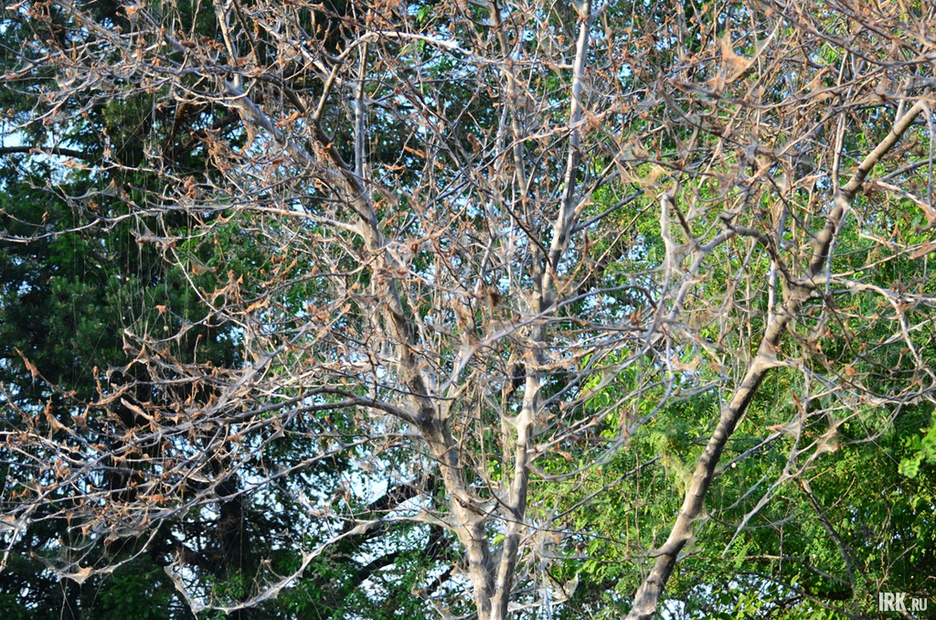 Этим летом яблони Иркутска снова страдают от нашествия горностаевой моли. Декоративные деревья на улицах и во дворах города окутала паутина, в которой копошатся мерзкого вида гусеницы.