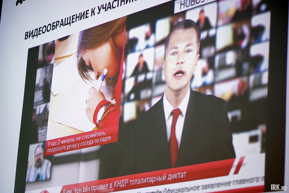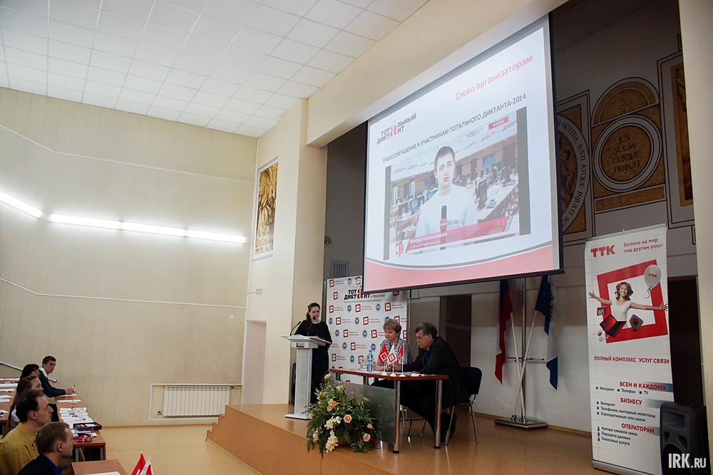 Текст в этом году написал Алексей Иванов, автор романа «Географ глобус пропил». Иркутским участникам акции его продиктовал директор драматического театра имени Н. П. Охлопкова Анатолий Стрельцов в актовом зале юридического института ИГУ. С этой же площадки вели онлайн-трансляцию.
