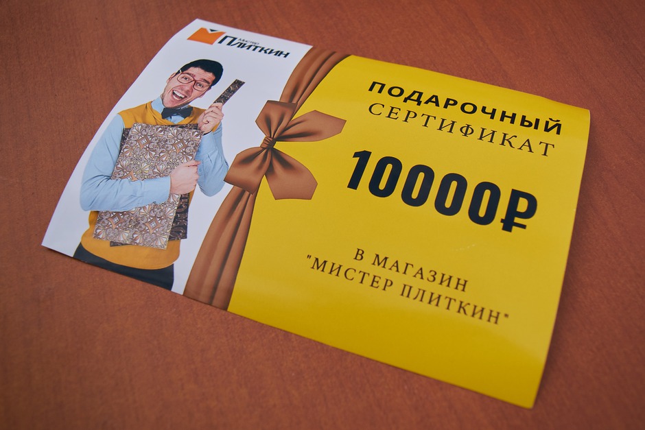 — Сертификат на 10000 рублей от сети магазинов керамической плитки «Мистер Плиткин».