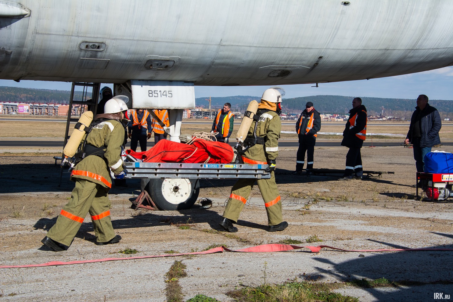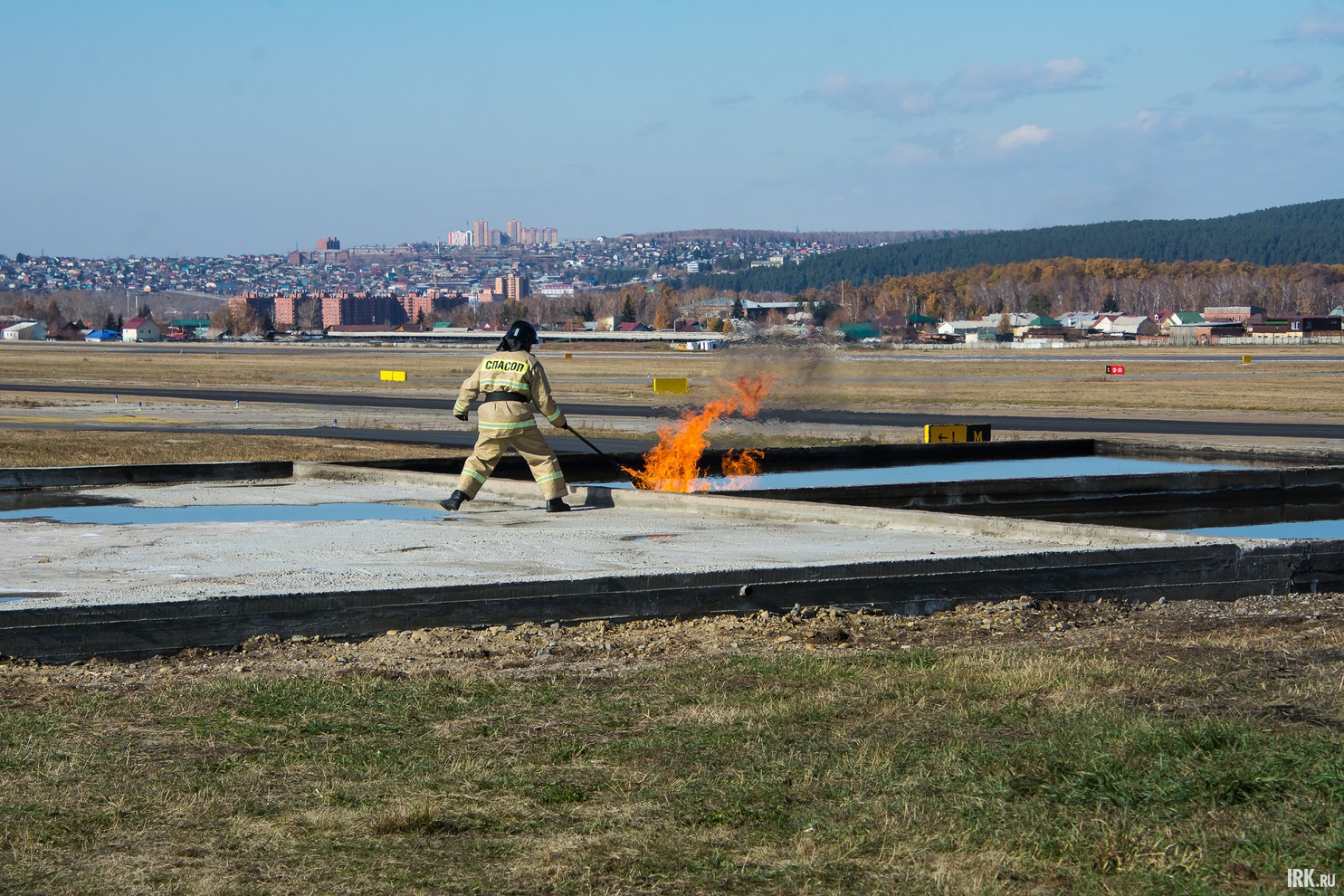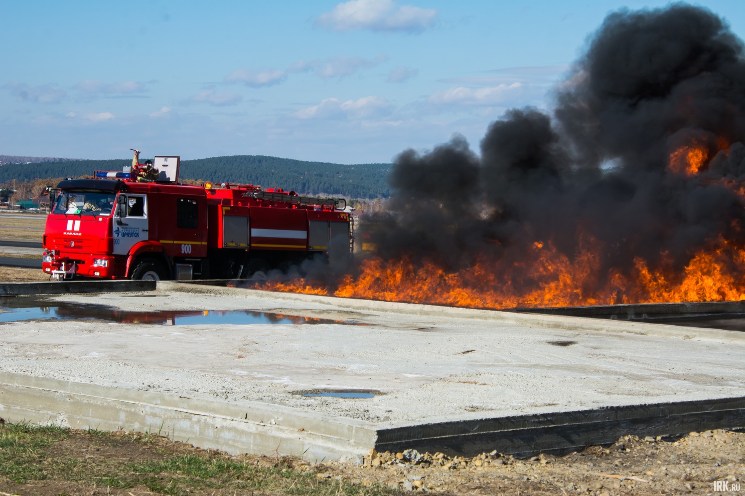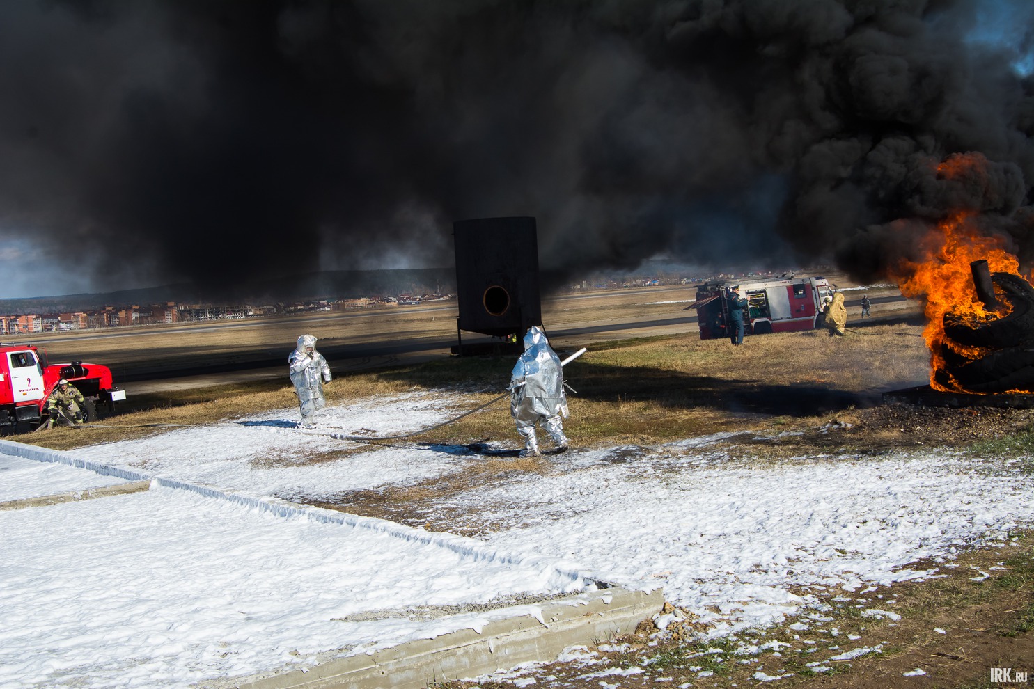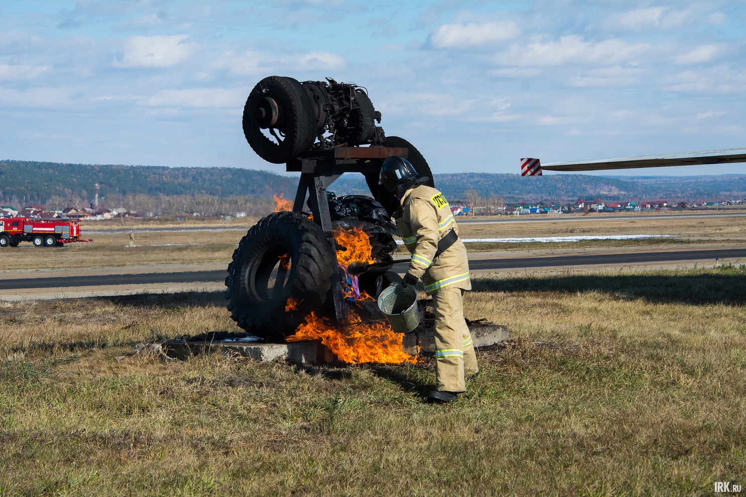 5 октября в международном аэропорту Иркутска прошли пожарно-тактические учения по ликвидации условного пожара на авиатранспорте. По легенде в результате аварийной посадки самолета оторвались шасси и загорелся двигатель. Также пламя охватило разлившееся авиационное топливо. Пострадавшие, роли которых исполнили статисты и манекены, не могли самостоятельно покинуть воздушное судно.