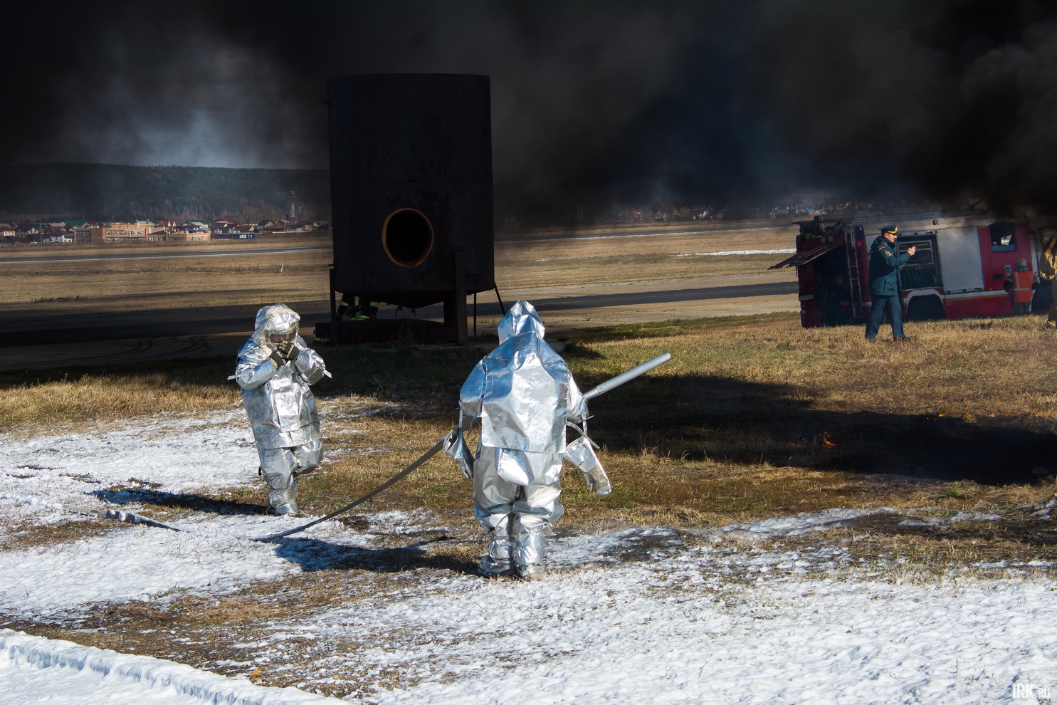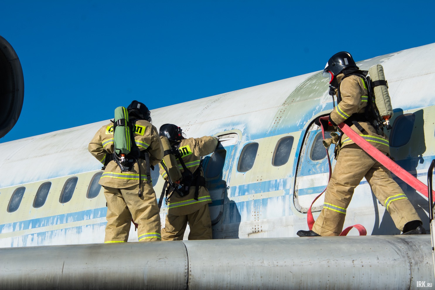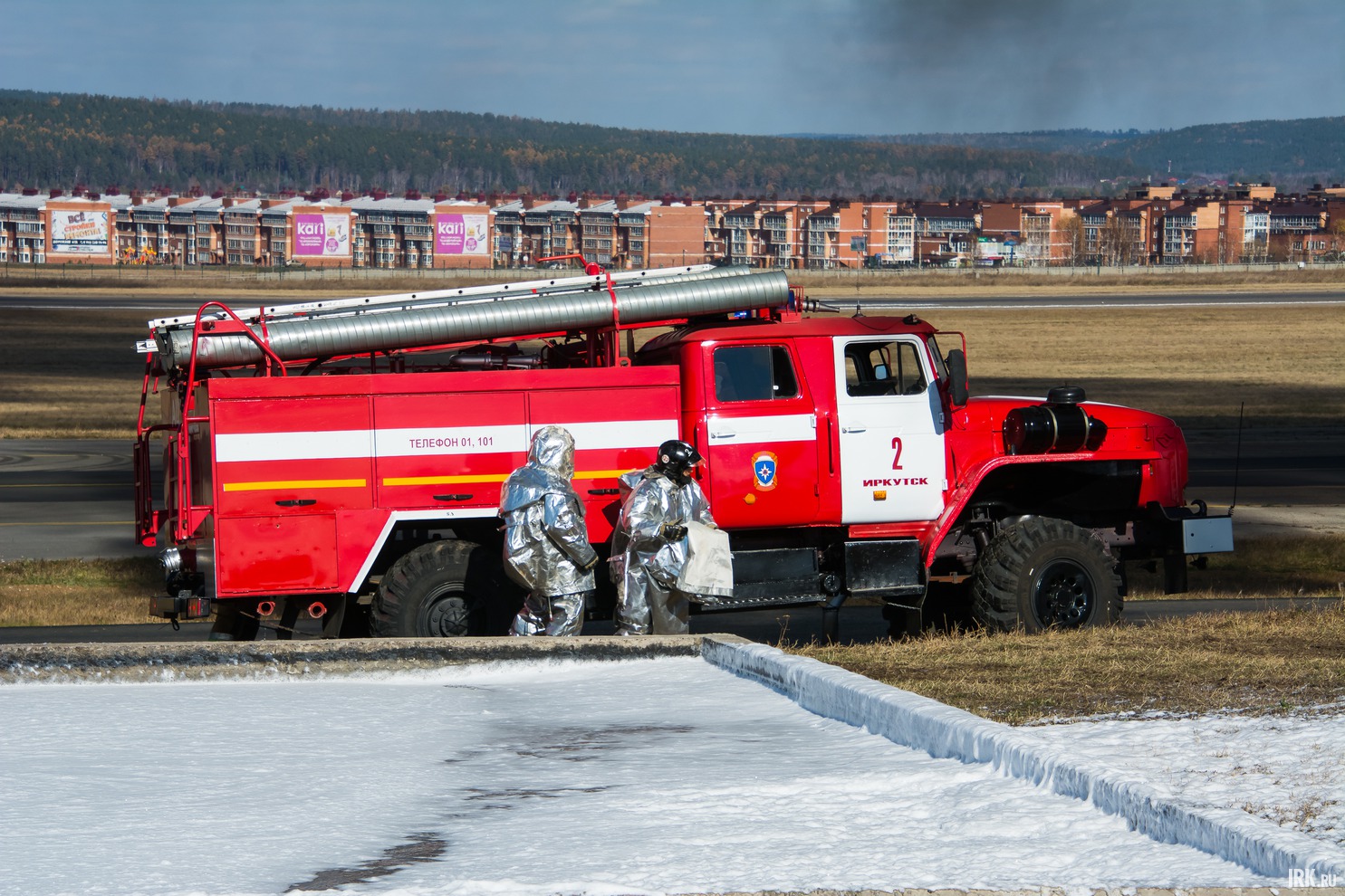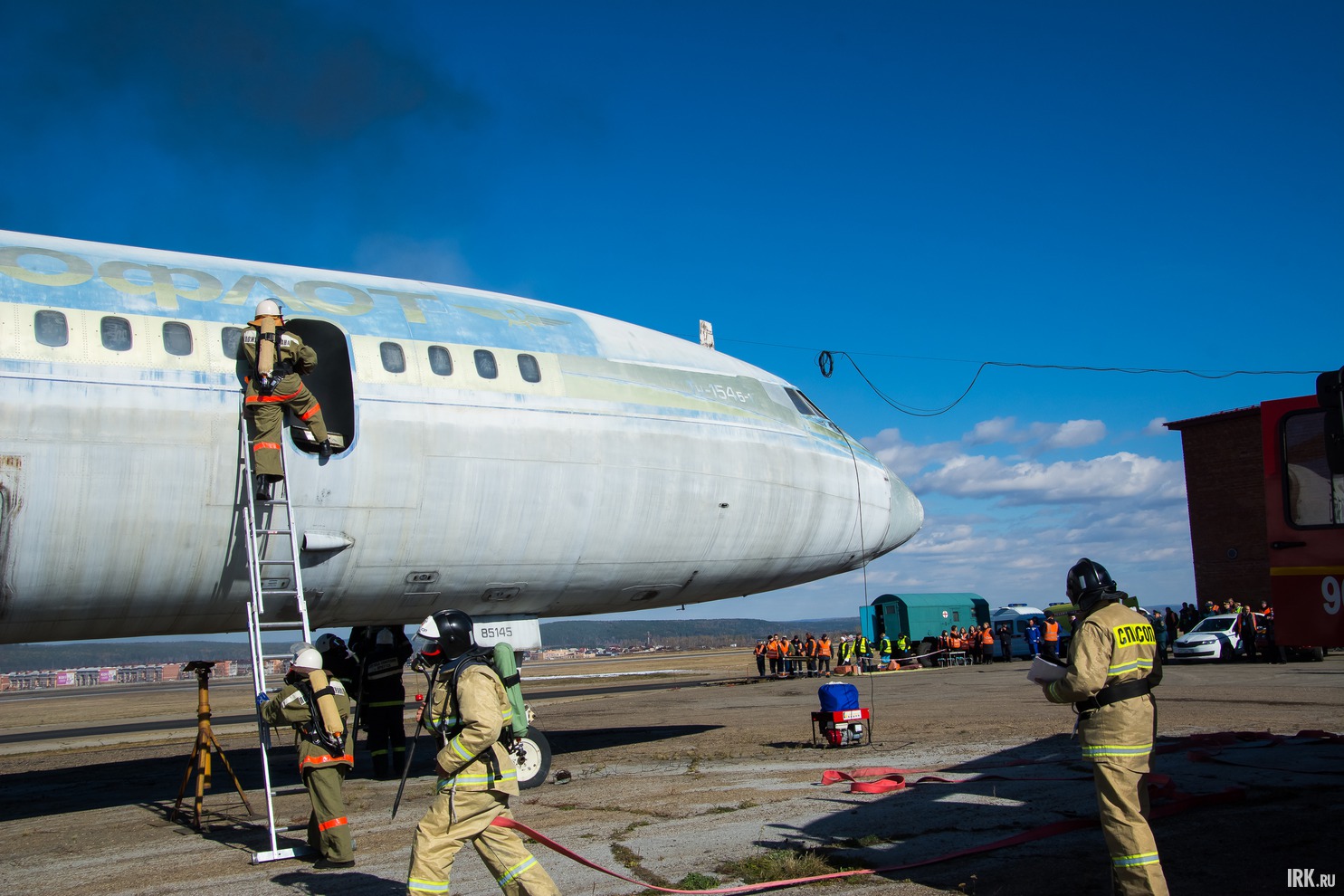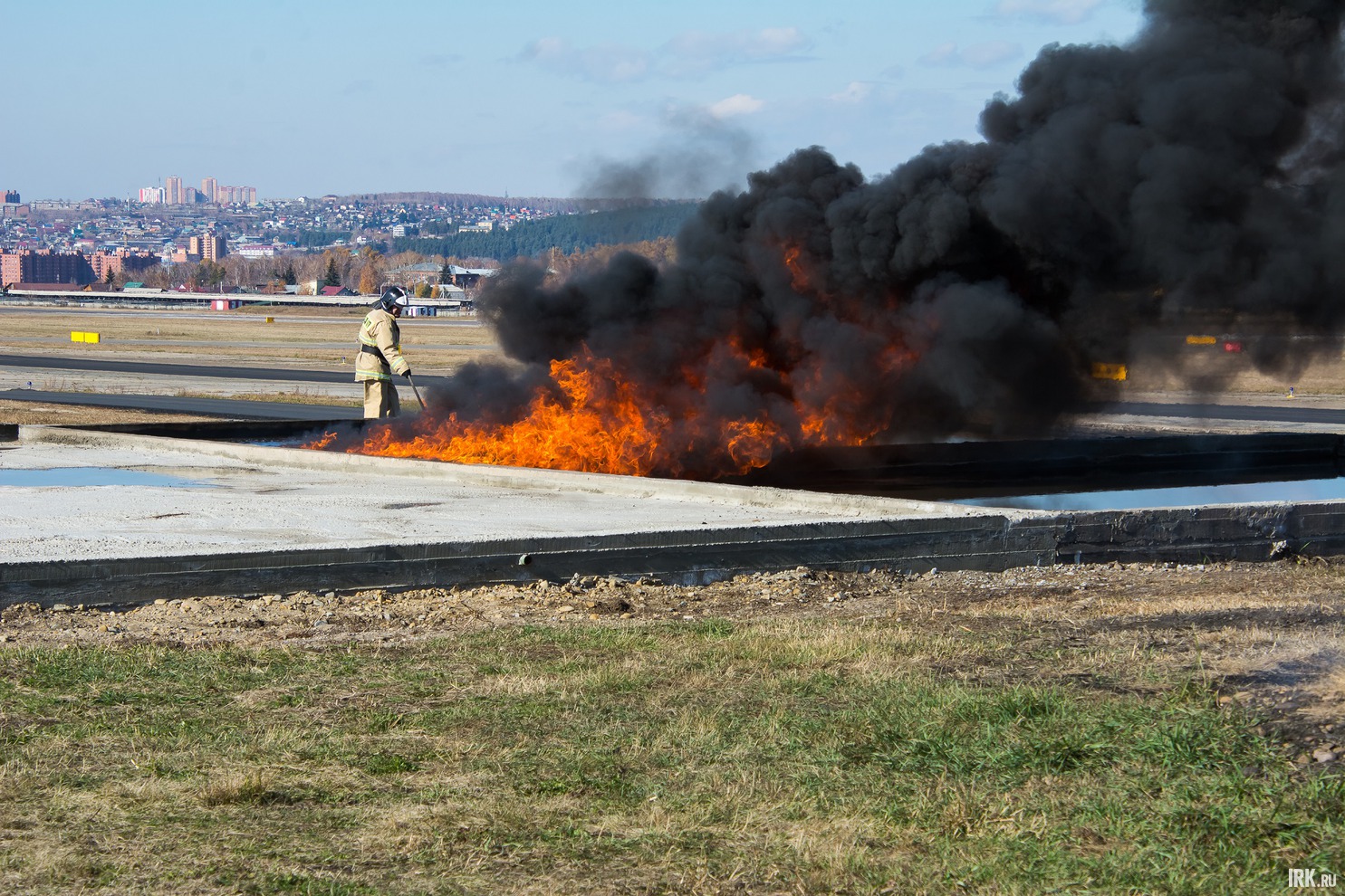 5 октября в международном аэропорту Иркутска прошли пожарно-тактические учения по ликвидации условного пожара на авиатранспорте. По легенде в результате аварийной посадки самолета оторвались шасси и загорелся двигатель. Также пламя охватило разлившееся авиационное топливо. Пострадавшие, роли которых исполнили статисты и манекены, не могли самостоятельно покинуть воздушное судно.