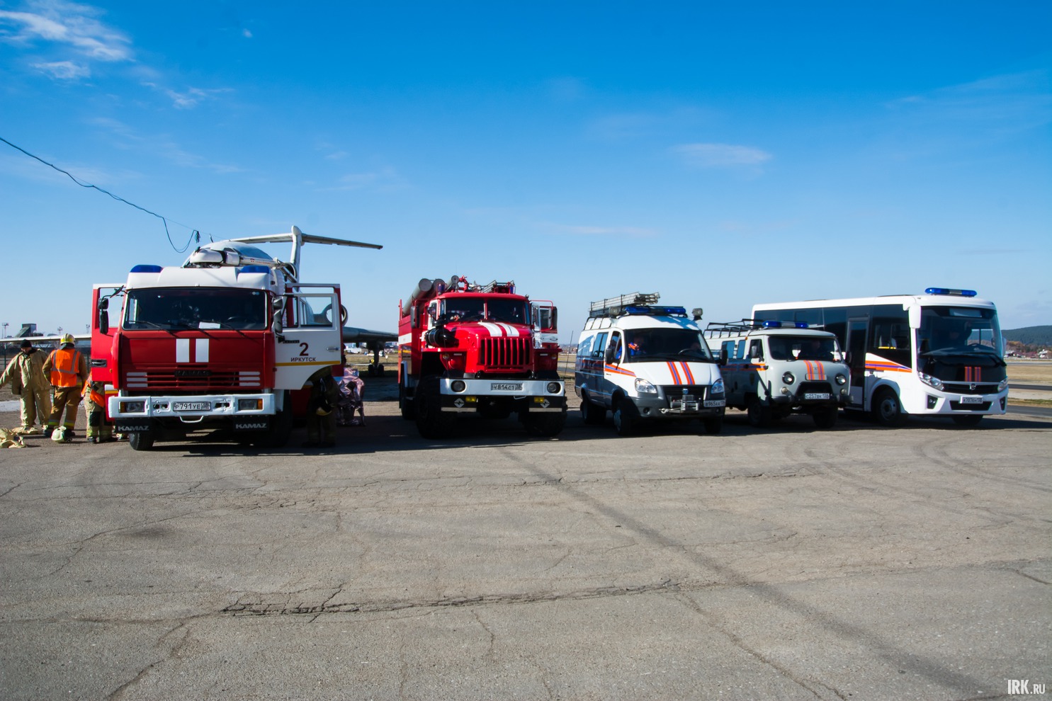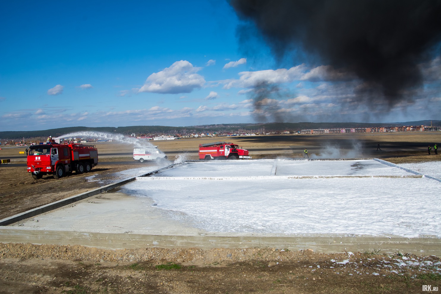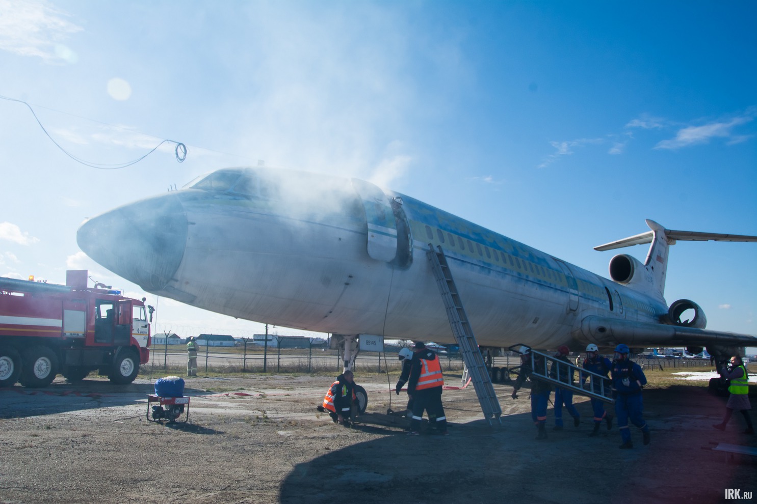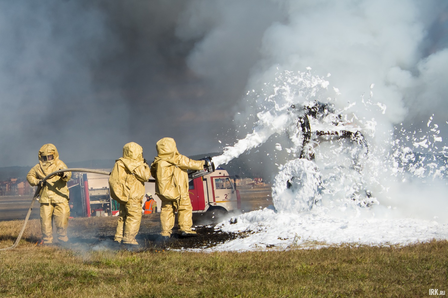 5 октября в международном аэропорту Иркутска прошли пожарно-тактические учения по ликвидации условного пожара на авиатранспорте. По легенде в результате аварийной посадки самолета оторвались шасси и загорелся двигатель. Также пламя охватило разлившееся авиационное топливо. Пострадавшие, роли которых исполнили статисты и манекены, не могли самостоятельно покинуть воздушное судно.