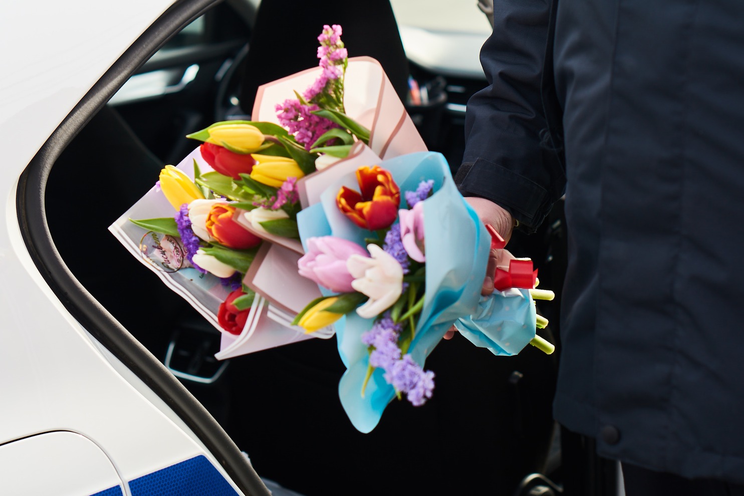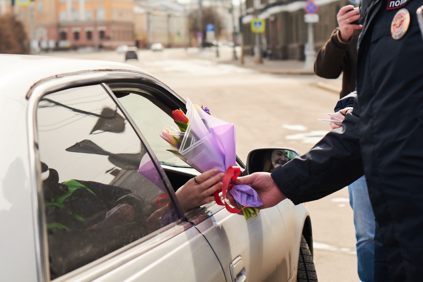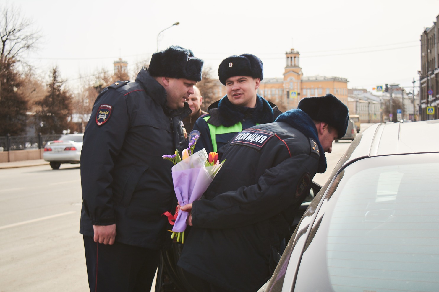 Тюльпаны, теплые поздравления и комплименты — 8 Марта сотрудники ГИБДД традиционно поздравили иркутянок-водителей в рамках акции «Цветы для автоледи!». Экипаж припарковался на улице Ленина, рядом со зданием администрации Иркутска. Дорожные полицейские Михаил Милицын и Петр Гаврилов высматривали девушек за рулем, останавливали и вместо проверки документов поздравляли с праздником.