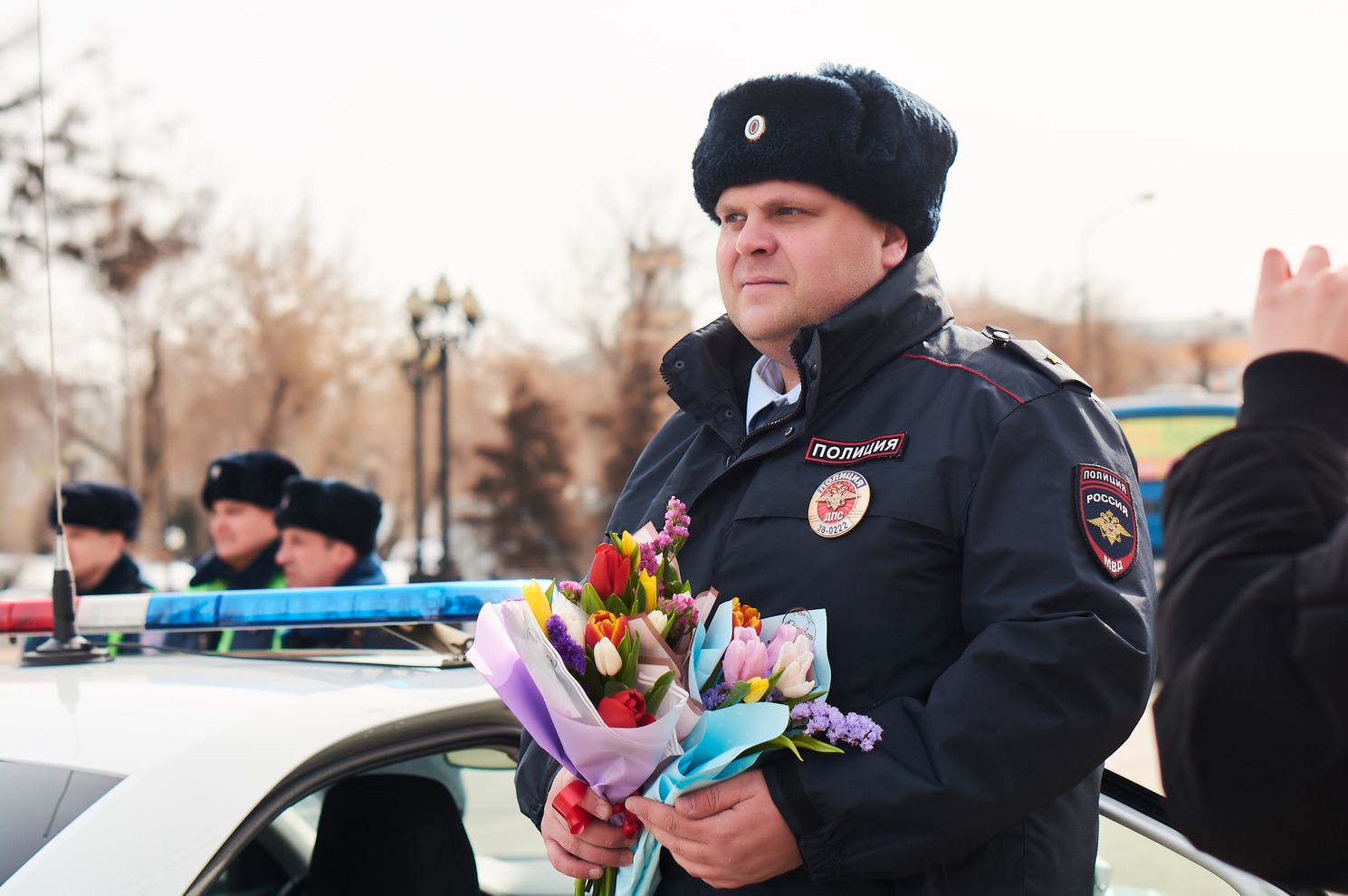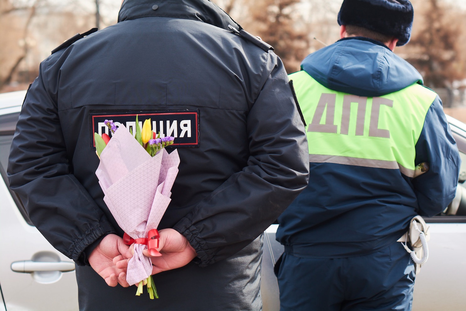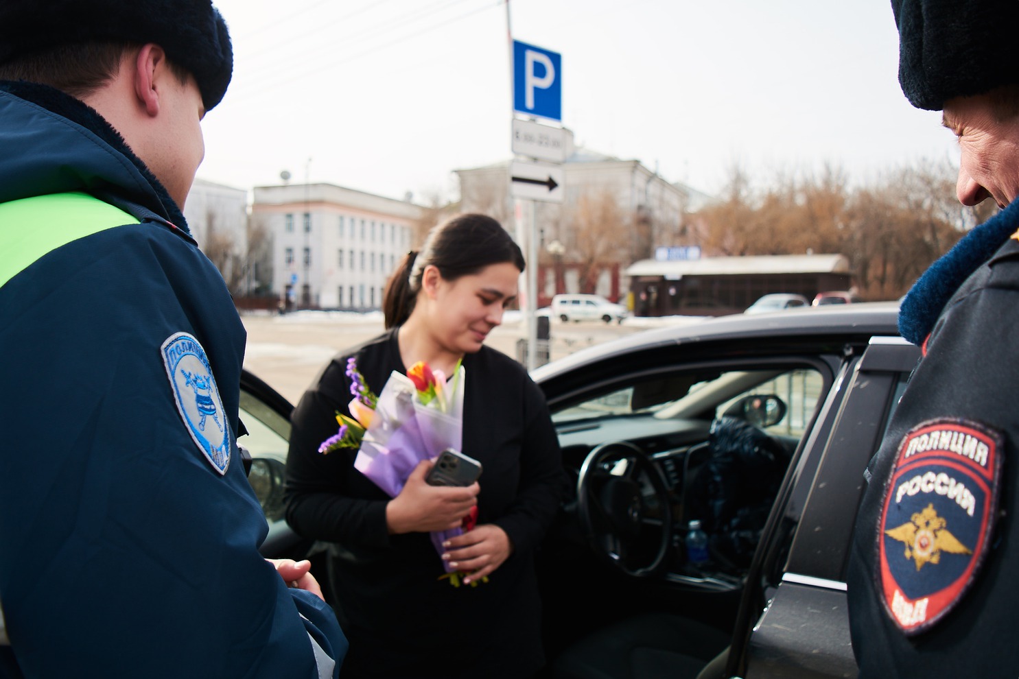 Цветы и комплименты от суровых полицейских: ГИБДД поздравила иркутянок с 8 Марта