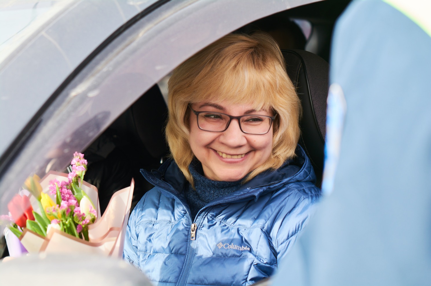 Автовладелица Оксана и ее дочь Даша поделились, что выходной день тоже проведут в теплом семейном кругу. Госавтоинспекторы обеим вручили тюльпаны.