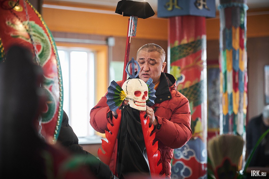 Обряд начался с молебна, на котором ламы дацана прочли священные книги. Для Дугжуубы заранее приготовили Соор – пирамиду в форме наконечника стрелы, увенчанную ритуальным черепом. Ее помещают в костер и сжигают.