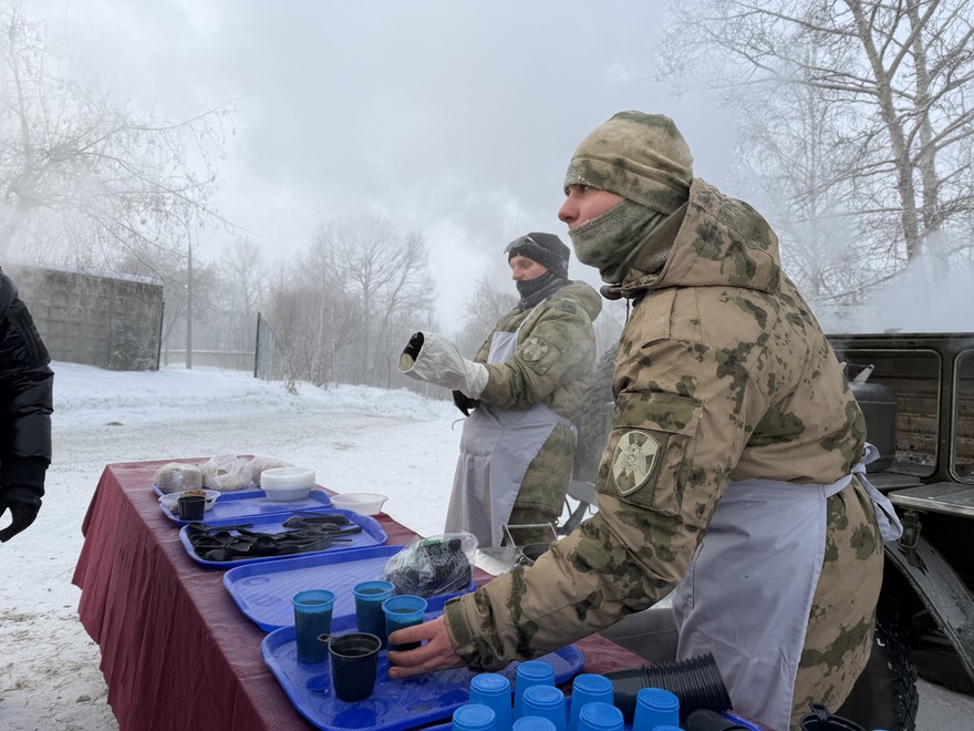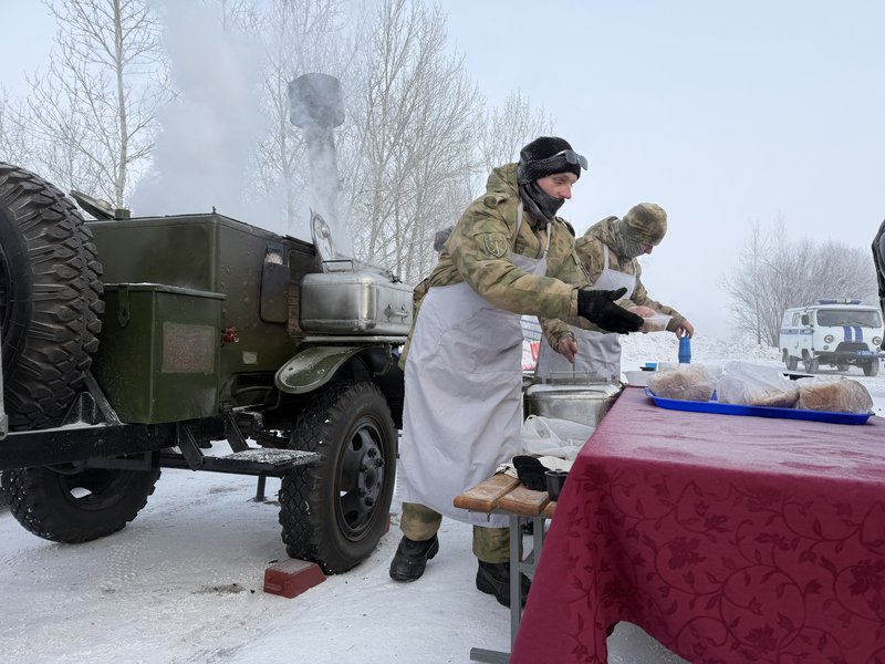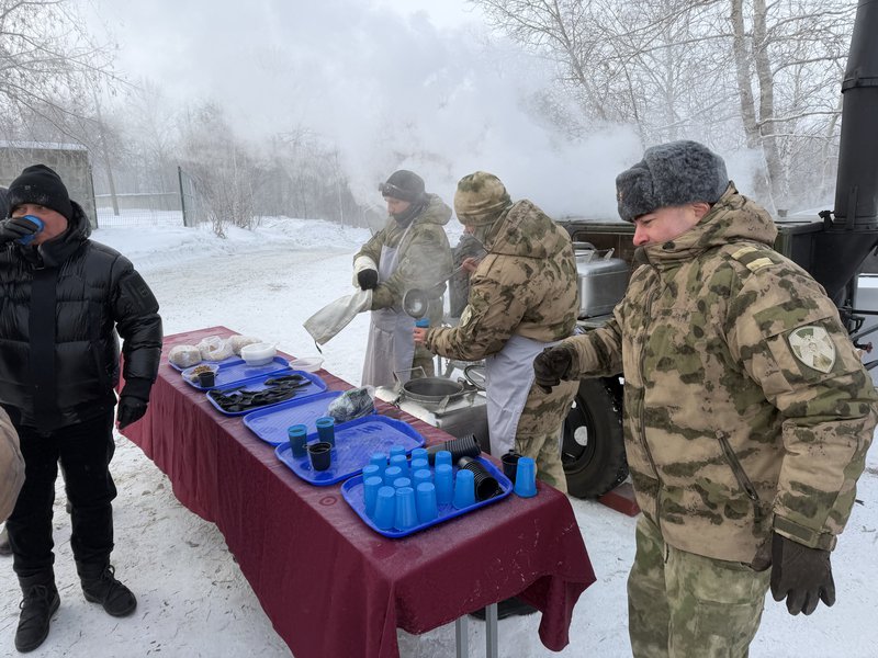 После купаний гостей ждала полевая кухня с горячим чаем и гречневой кашей. Затем группа отправилась в дом для пожилых людей, где Александр вместе со своими соратниками поздравил с 85-летием легендарного тренера по боксу Виктора Ивановича Бердуту. Вручили подарки, устроили чаепитие, пообщались с ветераном.