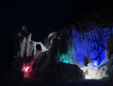 Скульптуры и наплески на скалах подсветили с помощью профессионального оборудования. Кроме того, гостям доступны кафе с безалкогольным глинтвейном, чаем и свежей выпечкой, а также пункт проката коньков и финских саней.