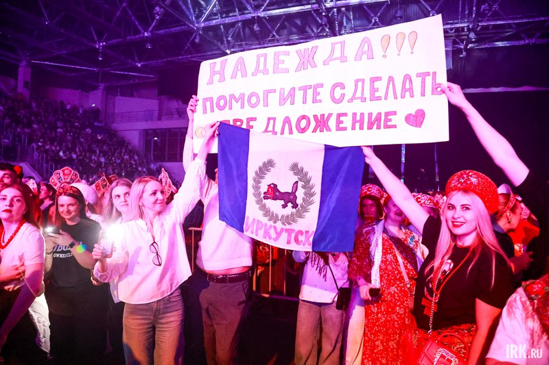Также на концерте иркутянин сделал предложение своей возлюблённой. Зритель, находясь в фан-зоне, пытался привлечь внимание певицы плакатом, чтобы она помогла ему сделать предложение. Парню удалось пройти в первый ряд. Увидев плакат, Надежда Кадышева пожелала паре жить долго и счастливо. «Как мы с Александром Григорьевичем 40 лет», — сказала артистка.