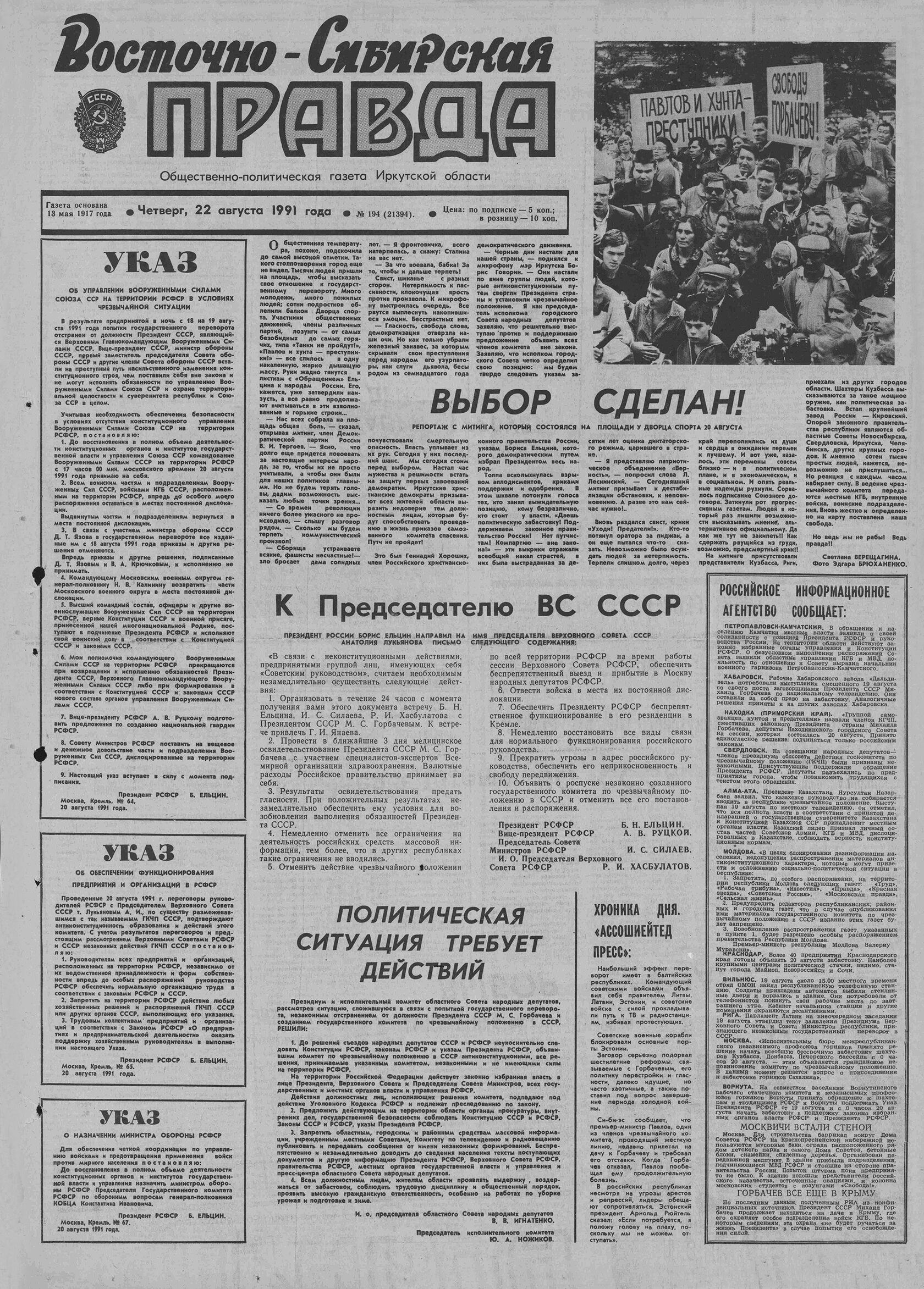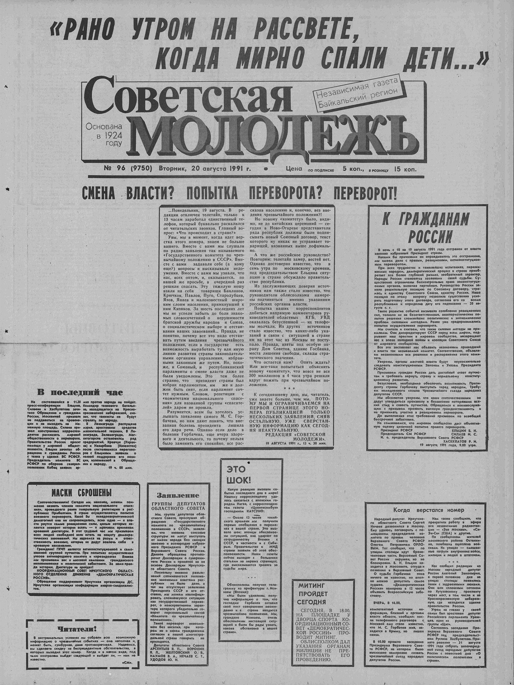 В газете была опубликована колонка заместителя главного редактора «Молодежки» Александра Семкина. Он говорил о моральной поддержке тысяч иркутян, которые выступили против ГКЧП. Но были и те, кто проявил малодушие и трусость, заняв сторону путчистов.
