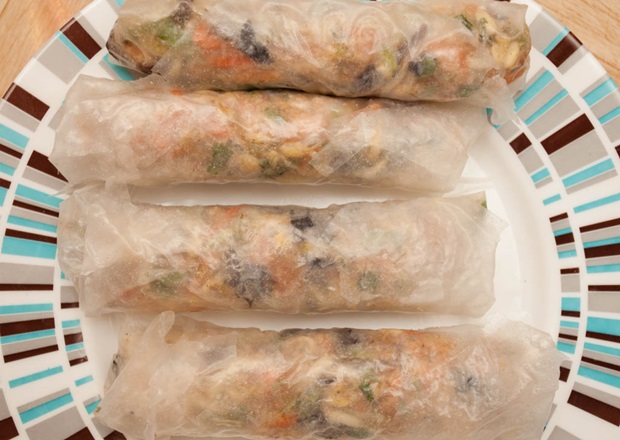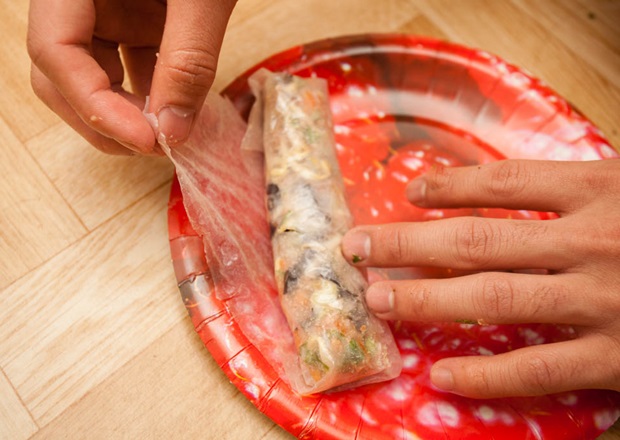 Размачиваем рисовые лепешки водой, чтобы они стали эластичными. Выкладываем в них начинку и аккуратно заворачиваем.