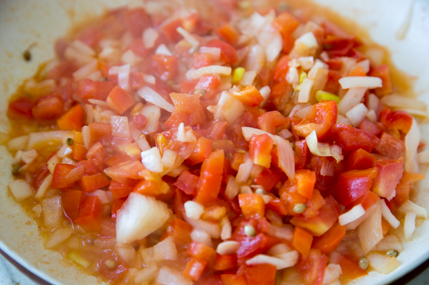 2. Измельчаем чеснок, нарезаем лук, перец, помидоры. Смешиваем с кориандром и жарим до готовности. В эту смесь также можно добавить свинину или куриное филе.