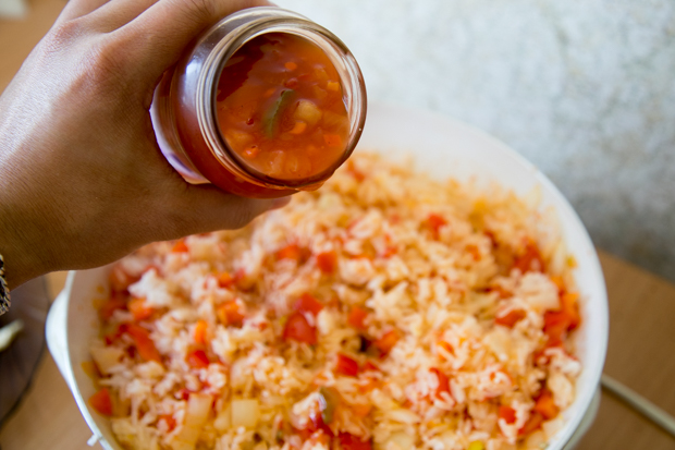 3. Добавляем в смесь отваренный рис. Заливаем сладкий соус и солим по вкусу. Готовим 3—5 минут.