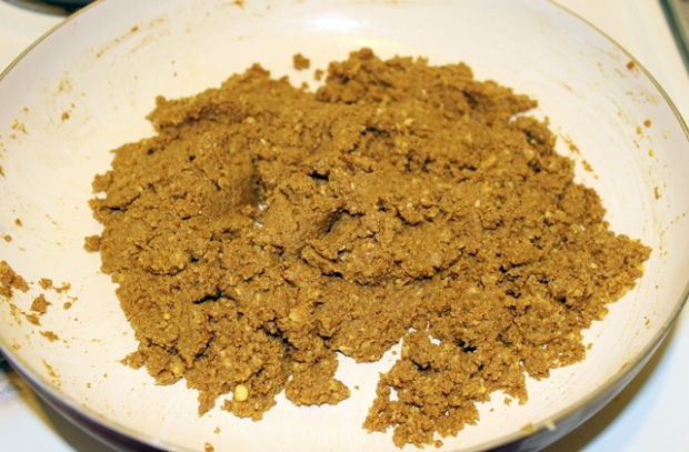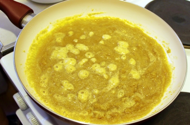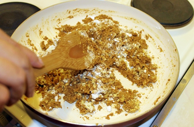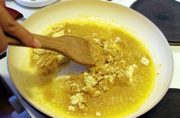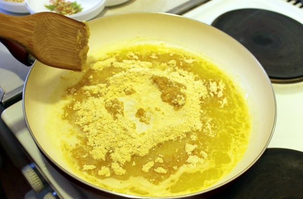 Сливочное масло растапливаем на сковороде. В него всыпаем нутовую муку и обжариваем в течение 15 минут, постоянно помешивая. Не пугайтесь, если мука станет темнее, так и должно быть.