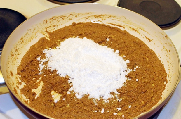 Через 15 минут в масляно-мучную смесь аккуратно добавляем порубленные орехи, кокосовую стружку и корицу. Все хорошо перемешиваем. Обжариваем еще две минуты и убираем с огня. На этом этапе пряный запах корицы уже чувствуется во всех уголках помещения, в котором вы готовите.